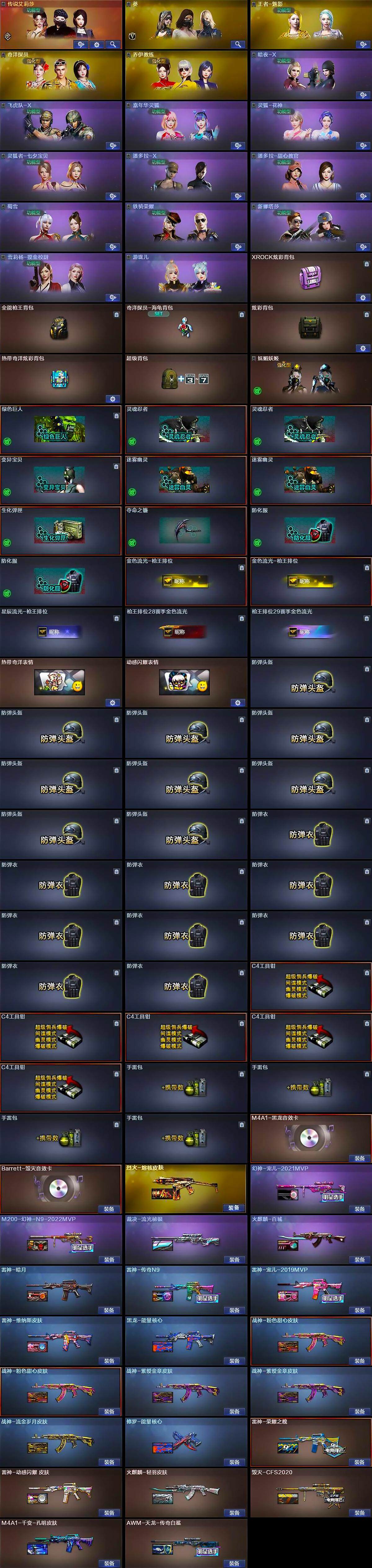 【皮肤】:幻神-宠儿-2021MVP,M200-幻神-N9-2022MVP,裁决-流光秘银,雷神-暗月,雷神-荣耀之魄,雷神-传奇N9,雷神-宠儿-2019MVP,雷神-维纳斯皮肤,雷神-动感闪耀 皮肤,火麒麟-轻羽皮肤,火麒麟-百城,毁灭-CFS2020,M4A1-千变-孔明皮肤,黑龙-能量核心,烈火-熔核皮肤,战神-粉色甜心皮肤*2,战神-紫绶金章皮肤*2,战神-流金岁月皮肤,AK47-B-常胜将军-刘备,AK47-B-常胜将军-孙权,AWM-天龙-传奇白鲨,修罗-能量核心