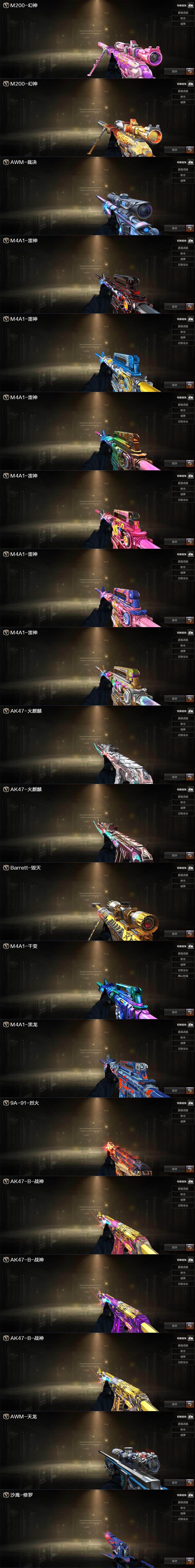 【英雄级武器】:M4A1-千变,AK47-火麒麟,M4A1-黑龙,M4A1-雷神*2,M4A1-黑骑士,M4A1-死神,AK12-天启,AN94-超新星,AK47-雷暴,无影-神兵利器,黑武士-锦绣游龙,超新星-热带奇洋,M4A1-玫瑰精灵,QBZ03-金色蔷薇,烈火-动感闪耀,AK-47-猩红传说*2,AK47-B-战神,黑骑士-海王,白虎之魄-觉醒版,Barrett-毁灭,AWM-裁决,M200-幻神,汤姆逊-烈龙*5,沙鹰-修罗*5,USP-雷暴,天神-动感闪耀,屠龙,龙啸*3,擎天,麒麟刺,屠龙-动感闪耀,龙啸-热带奇洋,斩神刀-雷暴,王者之锋-觉醒版*2,王者之啸-觉醒版,王者之击-觉醒版,高爆手雷-雷暴*4,高爆手雷-竞技荣光,手雷-动感闪耀,高爆手雷-云龙,手雷-热带奇洋,闪光弹-雷暴*4,烟雾弹-雷暴*4,烟雾弹-云龙