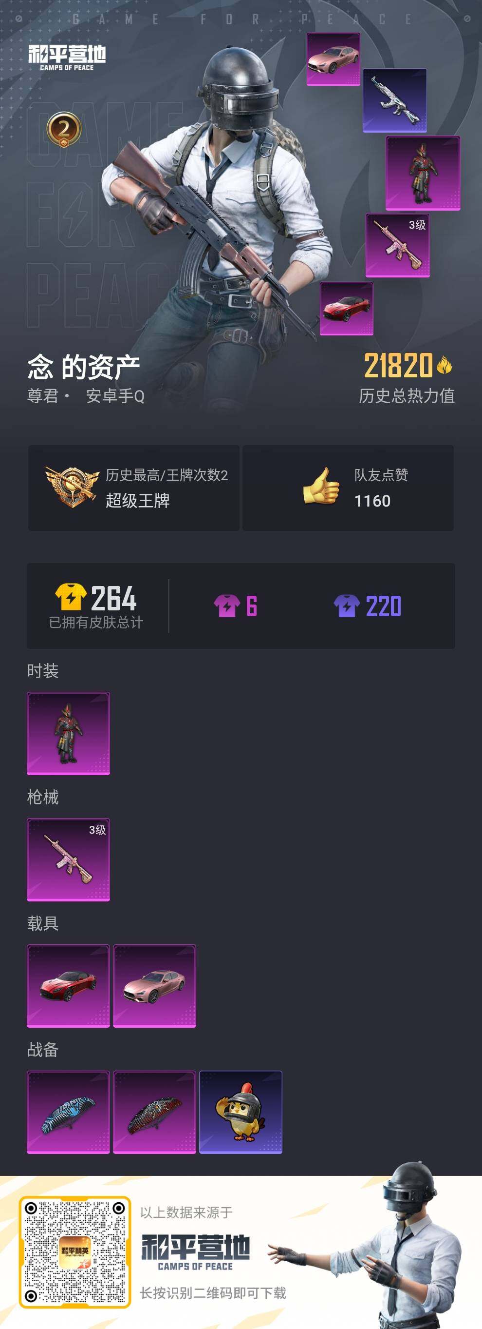 - [8887483]实名: 可修改 时装数: 506 载具数: 2 枪械数: 216 战备数: 153 热门装扮: 梦幻火箭(新101),呆萌铁蟹,深海小丑鱼,炙焰红王,冰霜白皇,奶芙汪汪,动感兔斯基,仲夏莫吉托,第五大道,月影灵韵,星穹咏叹调 载具: 玛莎拉蒂Ghibli(蓝),双人摩托-梦幻火箭 稀有枪皮: M416五爪金龙,M762激战未来,UMP45相思残雪,AKM梦之光华,SCAR-L青春物语,M16A4垂柳戏鸭,GROZA旋转彩虹,SPAS-12音爆索尼克,SCAR-L-锦绣绵绵,Kar98K-巳巳如意,AUG-暖羊咩咩 亮点: 7粉装-11特效-2载具-热力值70512-总套装506-总枪皮216-王牌印记9-历史最高超级王牌11星-粉套-冰霜白皇,粉套-炙焰红王,粉套-第五大道,粉套-仲夏莫吉托,角色-月影灵韵,粉套-星穹咏叹调-AKM-梦之光华(5级),M16A4-垂柳戏鸭(4级),SCAR-L-青春物语(5级),SCAR-L-锦绣绵绵(5级),M416-五爪金龙(5级),GROZA-旋转彩虹(5级),AUG-暖羊咩咩(5级),M762-激战未来(5级),Kar98K-巳巳如意(5级),UMP45-相思残雪(7级),SPAS-12-音爆索尼克(5级)-玛莎拉蒂Ghibli(蓝),双人摩托-梦幻火箭-套装-特训学院,套装-猎鹰,套装-黄色运动,套装-蓝色运动,套装-白色伏地魔,套装-黑色伏地魔,套装-竞技名士,套装-猛禽,套装-长空猛禽,套装-竞技勇士朋克,套装-黎明保卫者,套装-海岛探路者,套装-浪漫天命,套装-春日漫步,套装-沙漠毒蛇,套装-幻影武者,套装-千禧之恋,套装-野性战心,套装-狂沙舞者,套装-森林游猎者,套装-荣耀,套装-热血青春,套装-沙漠兵团,套装-幻世战舞者,套装-清新柠檬,套装-弄潮海豚,套装-呆萌铁蟹,套装-甜蜜熊情侣,套装-缤纷果语,套装-龙魂突击队,套装-冰川特警,套装-元素星魂,套装-WiFi精灵,套装-麻辣教官,套装-粉红小猪,套装-北国孤狼,套装-精神漫游,套装-鹤鸣,套装-霓虹街区,套装-动感兔斯基人偶服,套装-探宝勇士,套装-牛气满满