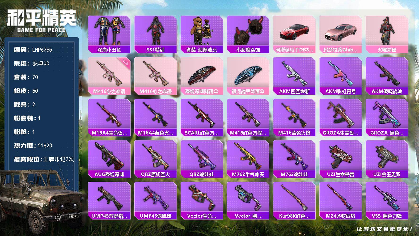 [13880477]可二次【店主推荐捡漏号!可直接换绑】 安卓 手Q-1粉装-1特效枪-2载具-0粉色飞行器-2.1w热力值-2王牌印记-70套装-60枪皮【热门品类】:套装-深海小丑鱼,套装-SS1特训,套装-浪漫波比,小恶魔头饰【粉色载具】:阿斯顿马丁DBS(红),玛莎拉蒂Ghibli(粉)【粉色套装】:粉装-火曜朱雀【粉色枪皮等级】:M416-心之恋语(三级)