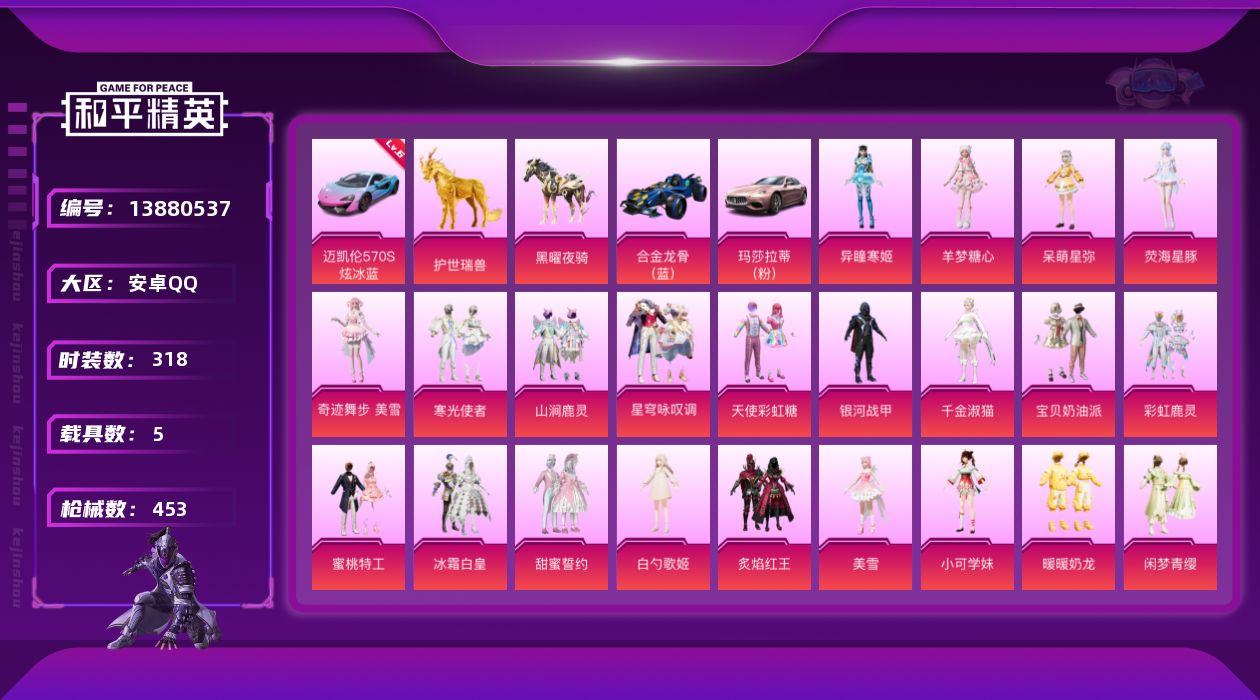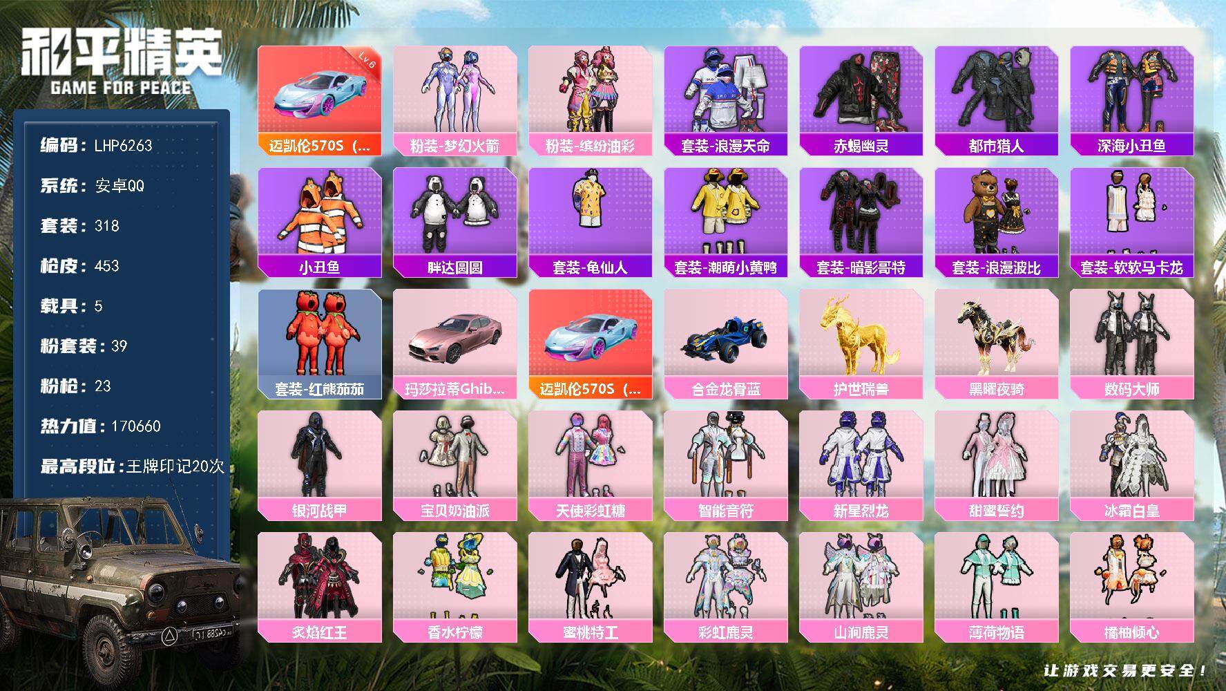 - [13504480]可二次【店主推荐捡漏号!可直接换绑】素材身法号 安卓 手Q-16粉装-13特效枪-6载具-4粉色飞行器-13.4w热力值-19王牌印记-305套装-408枪皮【热门品类】:粉装-梦幻火箭,套装-浪漫天命,套装-小丑鱼,套装-奇异狩猎者,套装-龟仙人,套装-暗影哥特,套装-粉红小猪,套装-摄影小熊猫,套装-红红火火,角色-8号机,角色-Mark.06,小恶魔头饰【粉色载具】:玛莎拉蒂Quattroporte(夜幕蓝),乔治巴顿战车(鎏金黑),宾利欧陆GT敞篷(火焰橘),迈凯伦570S(天际蓝),Formula E Gen2(幽光蓝),极速兔兔车【粉色套装】:粉装-数码大师,粉装-梦幻火箭,粉装-潮汐统领,粉装-冰霜白皇,粉装-炙焰红王,粉装-飓风飞鹰,粉装-庄周梦蝶,粉装-紫电风暴,粉装-仲夏莫吉托,粉装-玉鳞金羽,粉装-炎氏战神,粉装-未来歌姬,角色-水仙星,角色-圣堂之誓,粉装-金丰海韵,粉装-星穹咏叹调【粉色枪皮等级】:AKM-梦之光华(七级),SCAR-L-梦幻火箭(七级),M416-五爪金龙(七级),M416-电玩时刻(五级),GROZA-镜光银凌(五级),AUG-超新星(五级),M762-青锋波束(五级),UMP45-量子极限(五级),Kar98K-未来歌姬(五级),Kar98K-巳巳如意(五级),M417-第五大道(四级),SPAS-12-音爆索尼克(六级),DP-28-豹影疾电(五级)【粉色飞行器】:梦之光华飞行器,天之羽翼飞行器,粉樱探戈飞行器