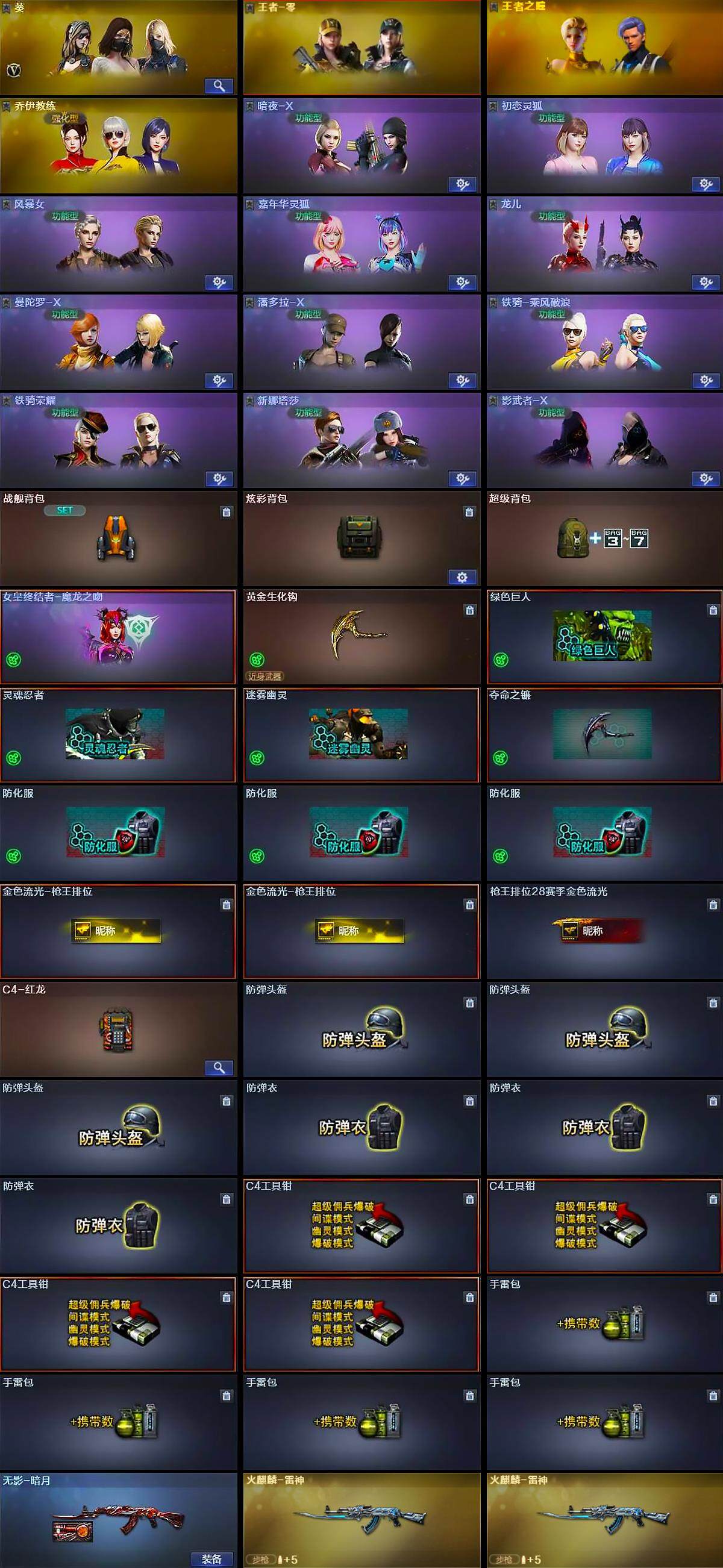 【道具】:战舰背包,炫彩背包,超级背包,女皇终结者-魔龙之吻,黄金生化钩,绿色巨人,灵魂忍者,迷雾幽灵,夺命之镰,防化服*3,金色流光-枪王排位*2,枪王排位28赛季金色流光,C4-红龙,防弹头盔*3,防弹衣*3,C4工具钳*4,手雷包*4