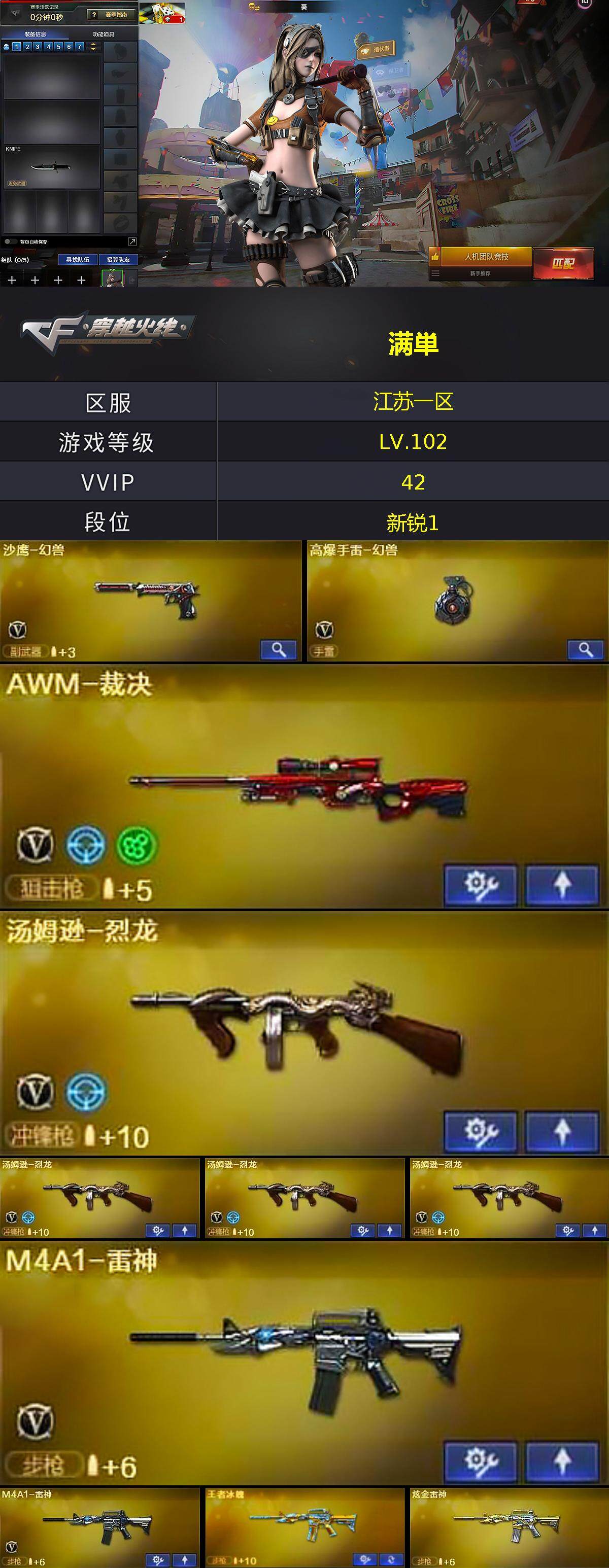 [13881867]江苏一区-42V-7王者-5炫金 【热门武器】:死亡之眼*2,M4A1-黑骑士,汤姆逊-烈龙*4,加特林-炼狱,沙鹰-修罗*3,高爆手雷-幻兽 【王者炫金武器】:王者之幻,王者之魄,王者之心,王者之怒,王者之力,炫金火麒麟,炫金雷神,炫金武士,炫金天龙*2 【皮肤】:火麒麟-雷神*2,无影-暗月 【角色】:葵,王者-零,王者之瞳,乔伊教练,暗夜-X,初恋灵狐,风暴女,嘉年华灵狐,龙儿,曼陀罗-X,潘多拉-X,铁骑-乘风破浪,铁骑荣耀,新娜塔莎,影武者-X 【人偶武器】:AWM-灵狐-15周年嘉年华,COP-旗袍,迷你牛牛 【暴走生化】:死亡之眼*2 【挑战大师】:激光毁灭者III,神圣爆裂者-末日III,阐释者III 【英雄级武器】:M4A1-千变,M4A1-雷神*2,M4A1-黑骑士,AK47-无影*3,AK12-天启,M4A1-武圣,AK47-黑鲨*2,无影-神兵利器,M4A1-玫瑰精灵,AWM-天龙,Barrett-毁灭*3,Barrett-极光,AWM-裁决,加特林-炼狱,汤姆逊-烈龙*4,AA-12-雷霆,沙鹰-修罗*3,沙鹰-幻兽,Glock18-武圣,屠龙*2,龙啸*3,擎天*2,女皇利刃-幻兽,高爆手雷-幻兽,闪光弹-幻兽,烟雾弹-幻兽 【道具】:战舰背包,炫彩背包,超级背包,女皇终结者-魔龙之吻,黄金生化钩,绿色巨人,灵魂忍者,迷雾幽灵,夺命之镰,防化服*3,金色流光-枪王排位*2,枪王排位28赛季金色流光,C4-红龙,防弹头盔*3,防弹衣*3,C4工具钳*4,手雷包*4 【特殊枪械】:1黑骑士,4烈龙,1炼狱