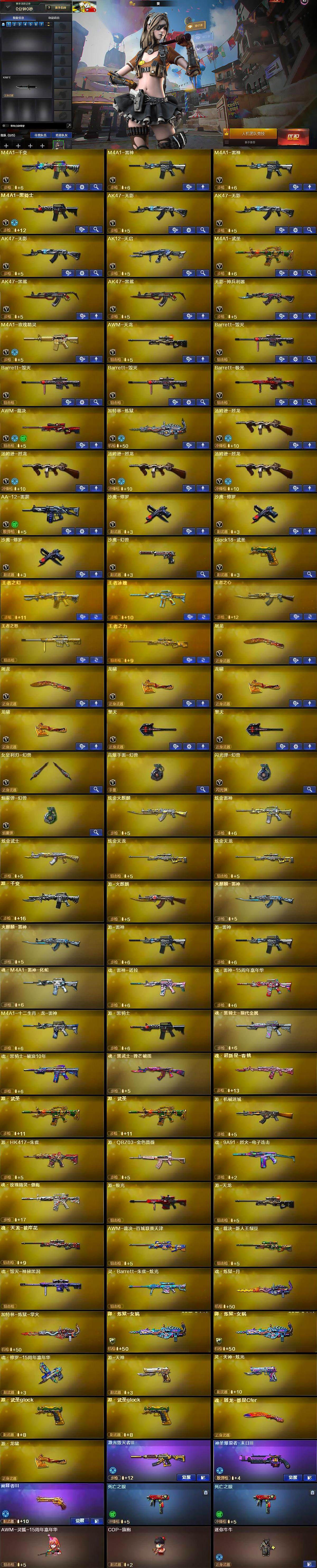 【英雄级武器】:M4A1-千变,M4A1-雷神*2,M4A1-黑骑士,AK47-无影*3,AK12-天启,M4A1-武圣,AK47-黑鲨*2,无影-神兵利器,M4A1-玫瑰精灵,AWM-天龙,Barrett-毁灭*3,Barrett-极光,AWM-裁决,加特林-炼狱,汤姆逊-烈龙*4,AA-12-雷霆,沙鹰-修罗*3,沙鹰-幻兽,Glock18-武圣,屠龙*2,龙啸*3,擎天*2,女皇利刃-幻兽,高爆手雷-幻兽,闪光弹-幻兽,烟雾弹-幻兽