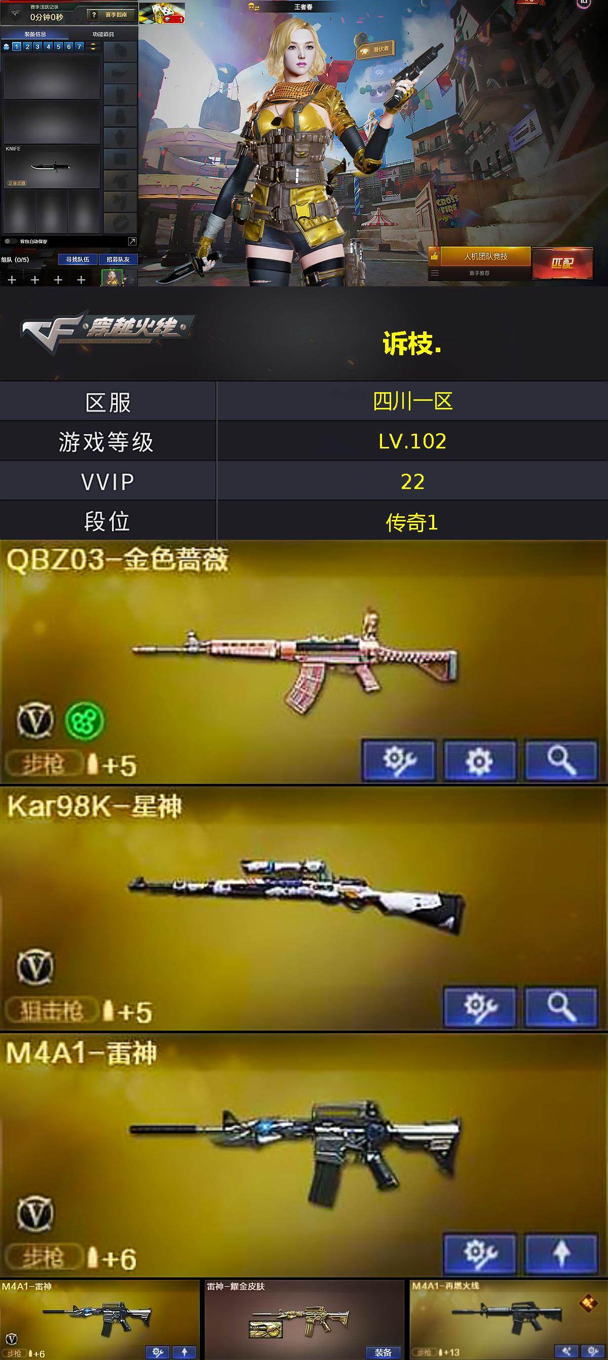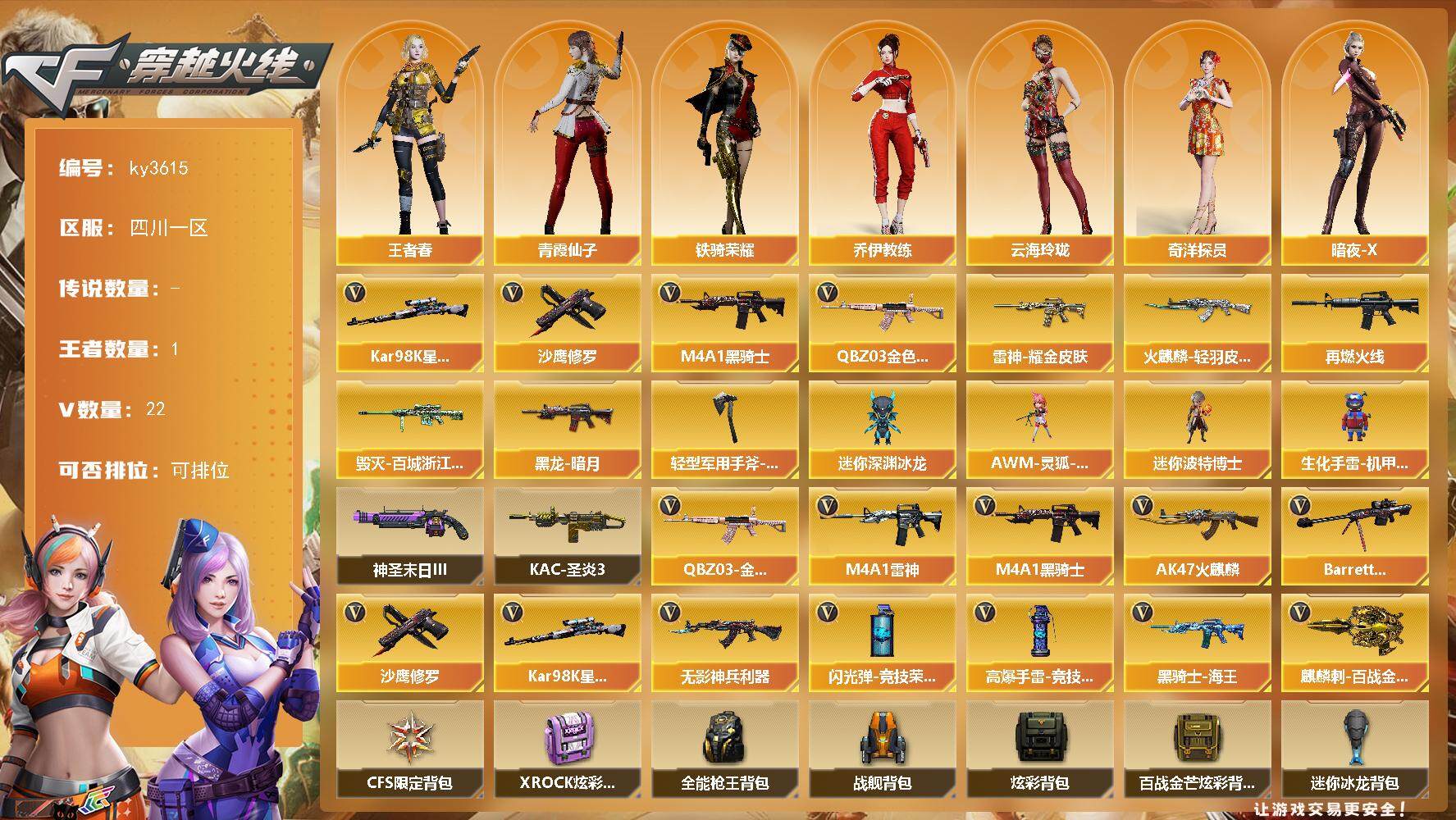 [13882096]四川一区-22V-1王者-0炫金 【热门武器】:QBZ03-金色蔷薇,Kar98K-星神,M4A1-黑骑士,沙鹰-修罗 【皮肤】:雷神-耀金皮肤,M4A1-再燃火线,火麒麟-轻羽皮肤,毁灭-百城浙江 皮肤,黑龙-暗月,轻型军用手斧-再燃火线 【角色】:王者春,奇洋探员,乔伊教练,云海玲珑,暗夜-X,风暴女,嘉年华灵狐,灵狐-花神,灵狐者-X,灵狐者-黄金海岸,龙儿,潘多拉-X,潘多拉-甜心教官,邱刚敖,青霞仙子,铁骑荣耀,兔囡囡,雪莉杨,樱-战斗天使 【人偶武器】:AWM-灵狐-15周年嘉年华,迷你深渊冰龙,迷你波特博士,生化手雷-机甲核心 【挑战大师】:KAC-圣炎切割者III,神圣爆裂者-末日III 【英雄级武器】:AK47-火麒麟,M4A1-雷神*2,M4A1-黑骑士,无影-神兵利器,QBZ03-金色蔷薇,黑骑士-海王,Barrett-毁灭,Kar98K-星神,沙鹰-修罗,麒麟刺-百战金芒,高爆手雷-竞技荣光,闪光弹-竞技荣光*6 【道具】:CFS限定背包,XROCK炫彩背包,全能枪王背包,战舰背包,炫彩背包,百战金芒炫彩背包,迷你冰龙背包,救世主-黑桃战神,绿色巨人,灵魂忍者,迷雾幽灵*2,夺命之镰,防化服*2,金色流光-枪王排位,星辰流光-枪王排位,枪王排位28赛季金色流光,枪王排位29赛季金色流光,语音特效-盛典烟火,萌萌小葵表情,EP战队名片,EP战队喷图,EP战队击杀图标,防弹头盔*5,防弹衣*5,C4工具钳*5,手雷包*5 【特殊枪械】:1黑骑士