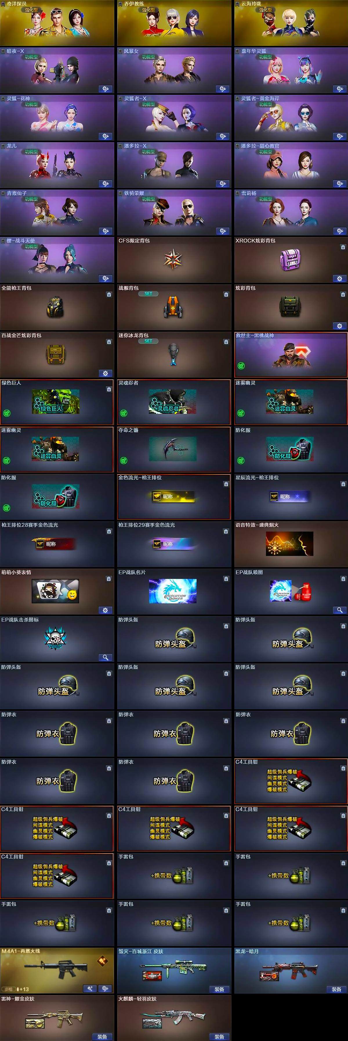 【道具】:CFS限定背包,XROCK炫彩背包,全能枪王背包,战舰背包,炫彩背包,百战金芒炫彩背包,迷你冰龙背包,救世主-黑桃战神,绿色巨人,灵魂忍者,迷雾幽灵*2,夺命之镰,防化服*2,金色流光-枪王排位,星辰流光-枪王排位,枪王排位28赛季金色流光,枪王排位29赛季金色流光,语音特效-盛典烟火,萌萌小葵表情,EP战队名片,EP战队喷图,EP战队击杀图标,防弹头盔*5,防弹衣*5,C4工具钳*5,手雷包*5