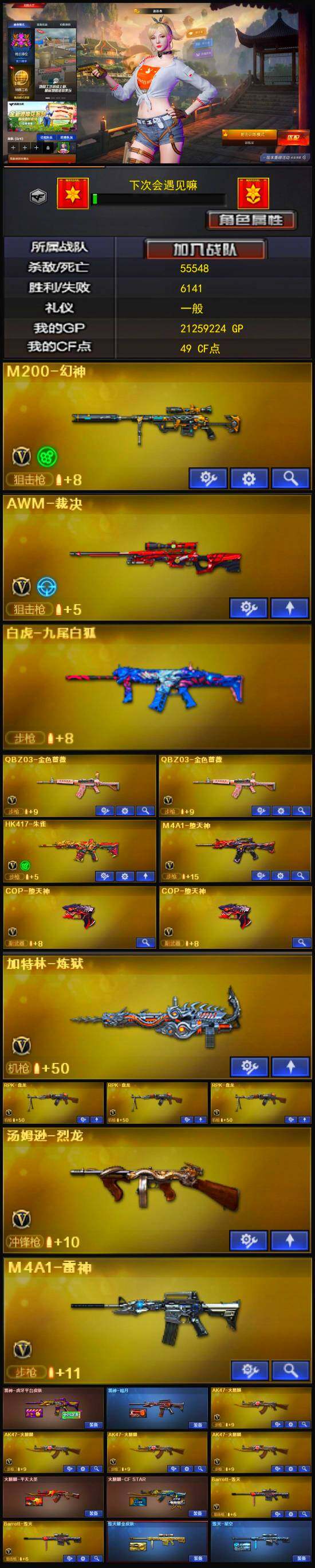 【热门武器】:QBZ03-金色蔷薇*2,HK417-朱雀,M200-幻神,C.A.T,汤姆逊-烈龙,RPK-盘龙*3,加特林-炼狱,羊驼玩偶,COP-堕天神*2,沙鹰-修罗