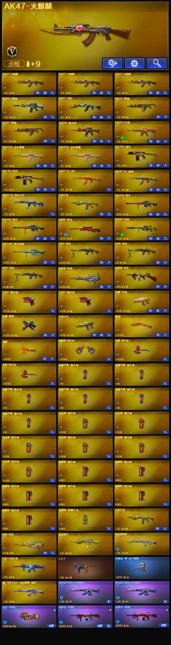 【英雄级武器】:AK47-火麒麟*4,M4A1-雷神,AK47-无影,AK47-黑鲨*2,M4A1-堕天神,HK417-朱雀,QBZ03-金色蔷薇*2,王者之武-觉醒版,AK-47-猩红传说*5,AK47-B-战神,Barrett-毁灭*2,AWM-裁决,M200-幻神,RPK-盘龙*3,加特林-炼狱,汤姆逊-烈龙,沙鹰-修罗,沙鹰-天神,COP-堕天神*2,王者之灵-觉醒版,屠龙,龙啸,麒麟刺-堕天神,龙啸-堕天神*2,麒麟刺-百战金芒,高爆手雷-堕天神*6,闪光弹-堕天神*6,烟雾弹-堕天神*6,烟雾弹-雷霆王者-觉醒版