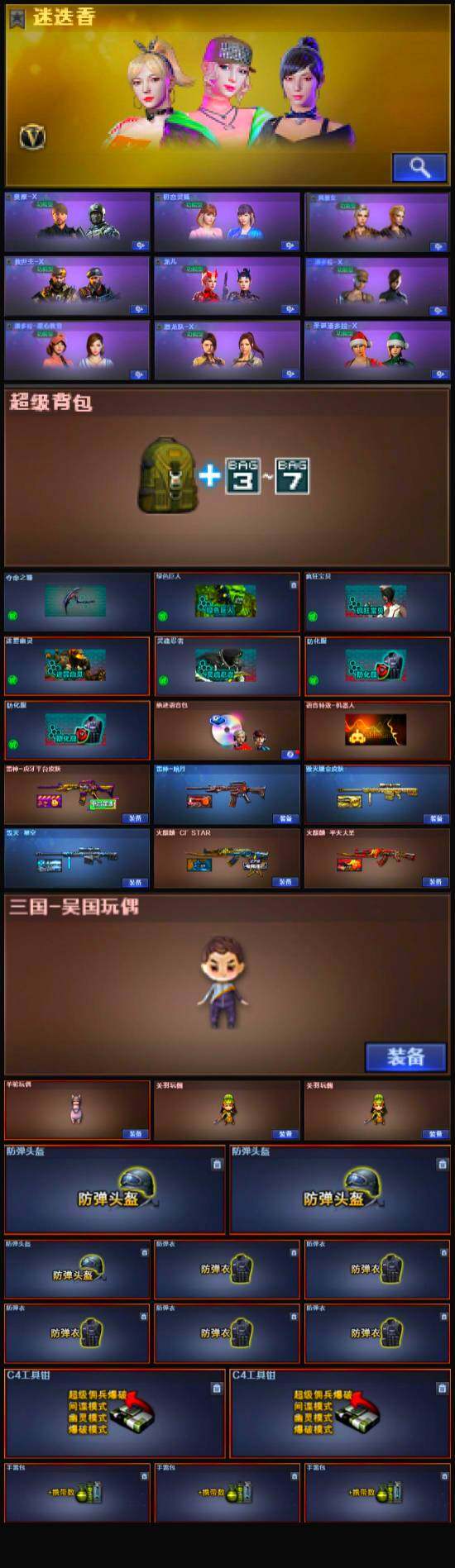 【道具】:背包-葫芦兄弟,超级背包,女皇终结者-魔龙之吻,绿色巨人,灵魂忍者,迷雾幽灵,夺命之镰,防化服*2,流光-鎏金之域,语音特效-机器人,防弹头盔*3,防弹衣*5,C4工具钳*2,手雷包*3