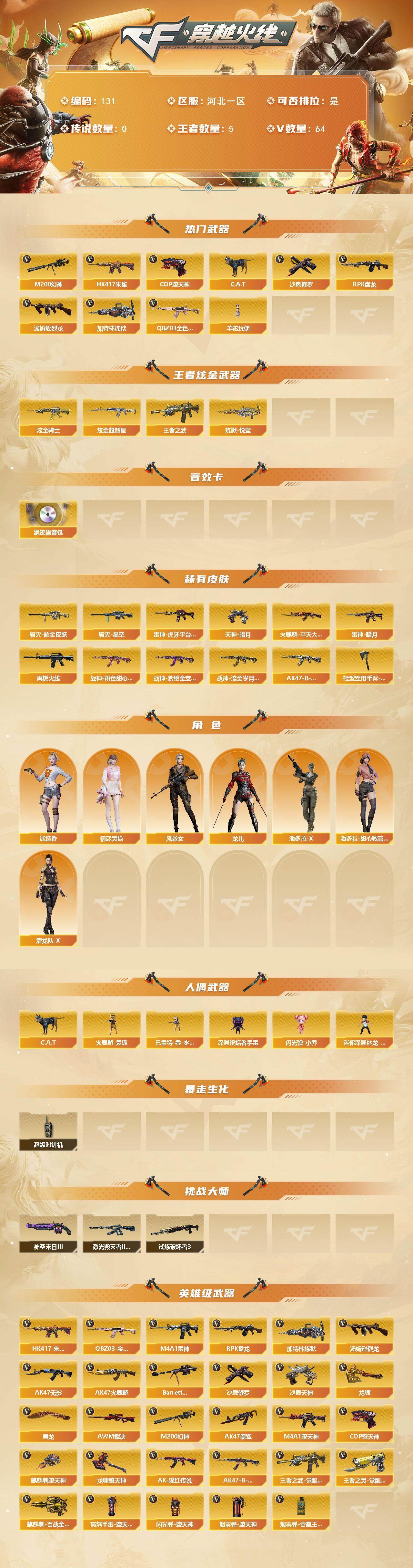 [13882039]河北一区-64V-5王者-2炫金 【热门武器】:QBZ03-金色蔷薇*2,HK417-朱雀,M200-幻神,C.A.T,汤姆逊-烈龙,RPK-盘龙*3,加特林-炼狱,羊驼玩偶,COP-堕天神*2,沙鹰-修罗 【王者炫金武器】:王者之武,炼狱-悦蓝,炫金骑士,炫金超新星 【音效卡】:绝迹语音包 【皮肤】:雷神-暗月,雷神-虎牙平台皮肤,M4A1-再燃火线,火麒麟-平天大圣,毁灭耀金皮肤,毁灭-星空,战神-粉色甜心皮肤,战神-紫绶金章皮肤,战神-流金岁月皮肤*2,AK47-B-常胜将军-刘备,天神-暗月,轻型军用手斧-再燃火线 【角色】:迷迭香,初恋灵狐,风暴女,龙儿,潘多拉-X,潘多拉-甜心教官,潜龙队-X 【人偶武器】:火麒麟-灵狐,巴雷特-零-水下丽影,C.A.T,深渊终结者手雷,闪光弹-小乔,迷你深渊冰龙-王绿豆 【暴走生化】:超级对讲机 【挑战大师】:激光毁灭者III-白马银枪*2,试炼破坏者III,神圣爆裂者-末日III 【英雄级武器】:AK47-火麒麟*4,M4A1-雷神,AK47-无影,AK47-黑鲨*2,M4A1-堕天神,HK417-朱雀,QBZ03-金色蔷薇*2,王者之武-觉醒版,AK-47-猩红传说*5,AK47-B-战神,Barrett-毁灭*2,AWM-裁决,M200-幻神,RPK-盘龙*3,加特林-炼狱,汤姆逊-烈龙,沙鹰-修罗,沙鹰-天神,COP-堕天神*2,王者之灵-觉醒版,屠龙,龙啸,麒麟刺-堕天神,龙啸-堕天神*2,麒麟刺-百战金芒,高爆手雷-堕天神*6,闪光弹-堕天神*6,烟雾弹-堕天神*6,烟雾弹-雷霆王者-觉醒版 【道具】:背包-葫芦兄弟,超级背包,女皇终结者-魔龙之吻,绿色巨人,灵魂忍者,迷雾幽灵,夺命之镰,防化服*2,流光-鎏金之域,语音特效-机器人,防弹头盔*3,防弹衣*5,C4工具钳*2,手雷包*3 【特殊枪械】:1烈龙,3盘龙,1炼狱