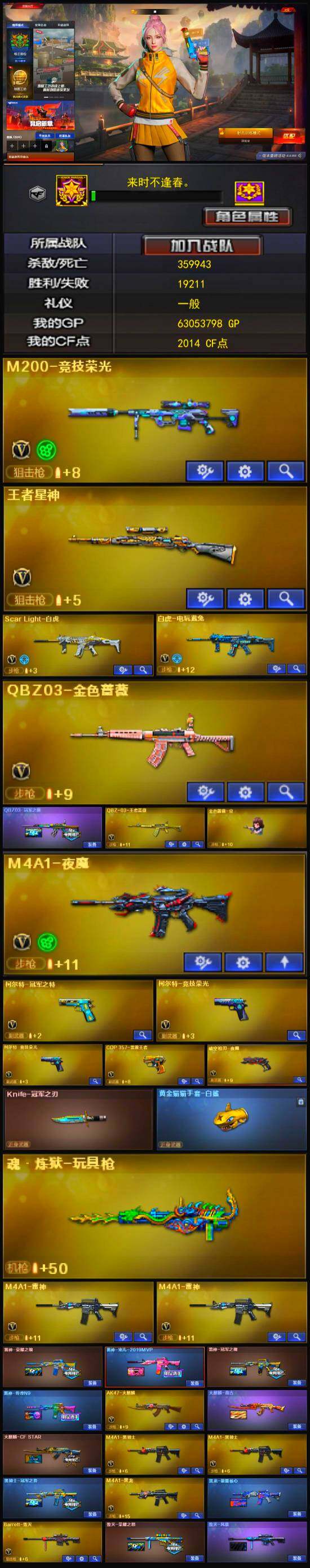 - [13377769]河南一区-60V-5王者-2炫金 【热门武器】:QBZ03-金色蔷薇,M200-竞技荣光,死亡之眼,汤姆逊-烈龙*6,RPK-盘龙*2,加特林-炼狱,COP-堕天神,沙鹰-修罗*2,金刚伞 【王者炫金武器】:炫金毁灭,炫金雷神 【音效卡】:M4A1-雷神音效卡,Barrett-碧霄极光音效卡 【皮肤】:雷神-星空,雷神-耀金皮肤,火麒麟-轻羽皮肤,天启-暗月,擎天-蒸汽钟表 皮肤 【角色】:葵,樱,电竞教官-云悠悠,王者零-华冠丽服,乔伊教练,初恋灵狐,飞虎队-X,嘉年华灵狐,娟娟 【人偶武器】:迷你深渊冰龙*3,迷你生化手雷,生化手雷-机甲核心 【暴走生化】:双面神,死亡之眼 【挑战大师】:致命乱世-超越Max,冰龙粉碎者-白马银枪,激光毁灭者III 【英雄级武器】:AK47-火麒麟,M4A1-雷神*2,M4A1-死神,AK12-天启,M4A1-龙血,QBZ03-金色蔷薇,烈火-动感闪耀,白虎之魄-觉醒版,Barrett-毁灭,AWM-裁决,M200-竞技荣光,王者之光-觉醒版,RPK-盘龙*2,加特林-炼狱,汤姆逊-烈龙*6,AA-12-雷霆,沙鹰-修罗*2,沙鹰-天神,COP-堕天神,柯尔特-竞技荣光,USP-神工天巧,天神-动感闪耀,屠龙,擎天,擎天-竞技荣光,唐刀-神工天巧,屠龙-动感闪耀,王者之啸-觉醒版,王者之刺-觉醒版,高爆手雷-竞技荣光*2,高爆手雷-神工天巧*4,手雷-动感闪耀,闪光弹-竞技荣光*6,闪光弹-神工天巧*2,烟雾弹-竞技荣光*5,烟雾弹-神工天巧*2,M4A1-赤狱骑士,Barrett-碧霄极光 【特殊枪械】:6烈龙,2盘龙,1炼狱