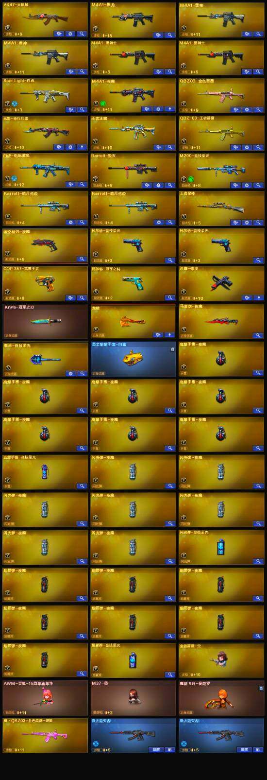 【热门武器】:QBZ03-金色蔷薇,Scar Light-白虎,M200-竞技荣光,白虎-电玩蓝兔,柯尔特-冠军之特,M4A1-黑骑士*2,金色蔷薇-空,沙鹰-修罗,Knife-冠军之刃*2,黄金猫猫手套-白鲨