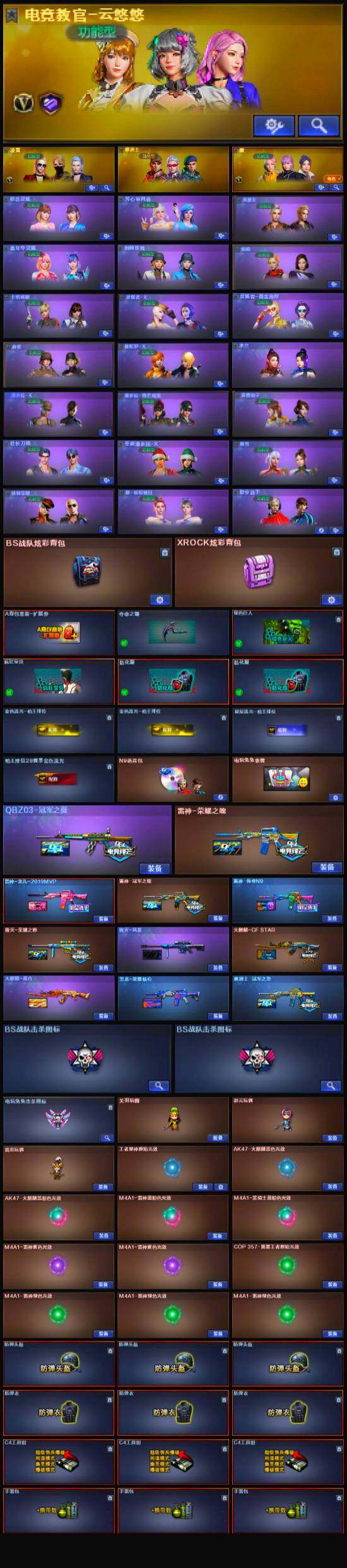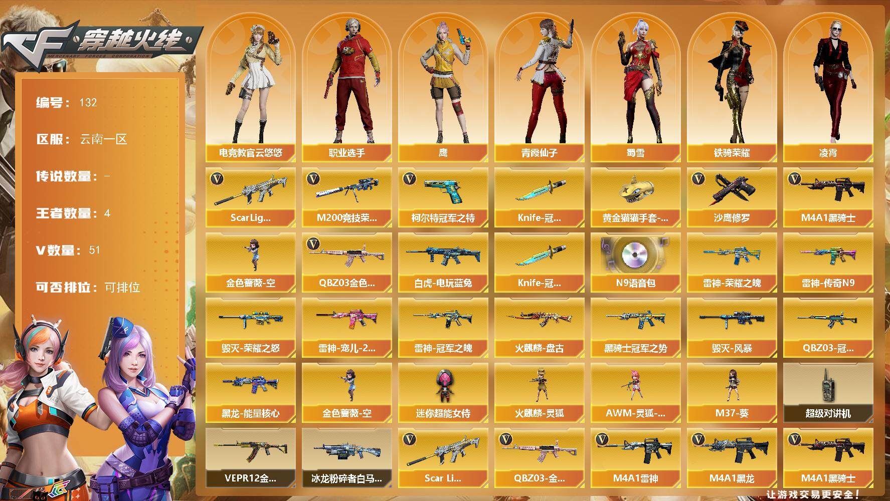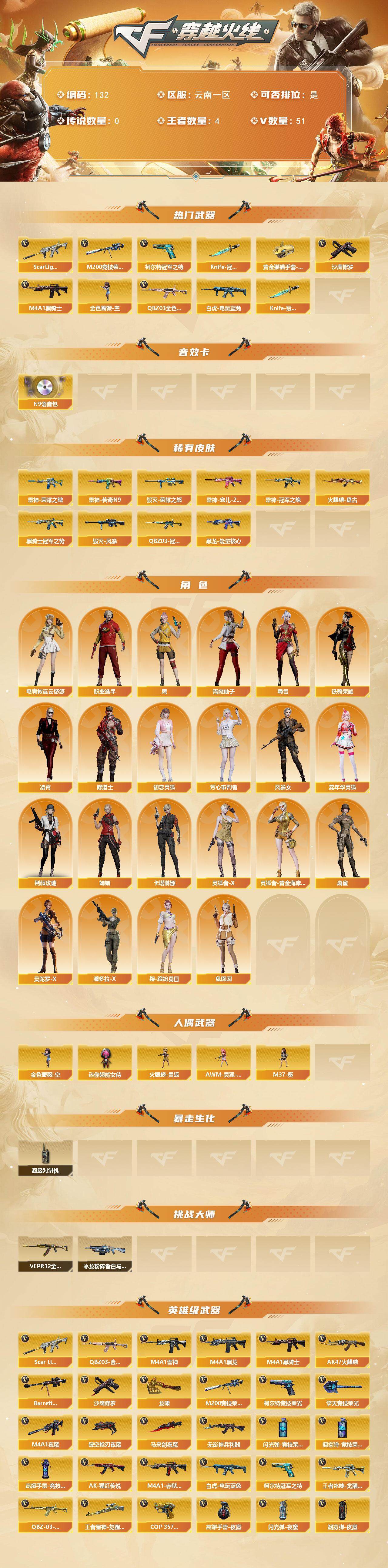 [13882326]云南一区-51V-4王者-0炫金 【热门武器】:QBZ03-金色蔷薇,Scar Light-白虎,M200-竞技荣光,白虎-电玩蓝兔,柯尔特-冠军之特,M4A1-黑骑士*2,金色蔷薇-空,沙鹰-修罗,Knife-冠军之刃*2,黄金猫猫手套-白鲨 【音效卡】:N9语音包 【皮肤】:QBZ03-冠军之薇,雷神-荣耀之魄,雷神-冠军之魄,雷神-传奇N9,雷神-宠儿-2019MVP,火麒麟-盘古,毁灭-荣耀之怒,毁灭-风暴,黑龙-能量核心,黑骑士-冠军之势 【角色】:凌霄,电竞教官-云悠悠,鹰,修道士,初恋灵狐,芳心审判者,风暴女,嘉年华灵狐,荆棘玫瑰,娟娟,卡塔琳娜,灵狐者-X,灵狐者-黄金海岸,麻雀,曼陀罗-X,潘多拉-X,青霞仙子,蜀雪,铁骑荣耀,兔囡囡,樱-缤纷夏日,职业选手 【人偶武器】:火麒麟-灵狐,金色蔷薇-空,AWM-灵狐-15周年嘉年华,M37-葵,迷你超能女侍 【暴走生化】:超级对讲机 【挑战大师】:冰龙粉碎者-白马银枪,VEPR-12-金魔 【英雄级武器】:AK47-火麒麟,M4A1-黑龙,M4A1-雷神*2,M4A1-黑骑士*2,Scar Light-白虎,M4A1-夜魔,无影-神兵利器,QBZ03-金色蔷薇,AK-47-猩红传说,王者冰魄-觉醒版,QBZ-03-王者蔷薇-觉醒版,白虎-电玩蓝兔,Barrett-毁灭,M200-竞技荣光,王者星神-觉醒版,沙鹰-修罗,COP 357-雷霆王者-觉醒版,柯尔特-冠军之特,柯尔特-竞技荣光*2,破空枪刃-夜魔,龙啸,马来剑-夜魔,擎天-竞技荣光,高爆手雷-夜魔*7,高爆手雷-竞技荣光,闪光弹-夜魔*7,闪光弹-竞技荣光,烟雾弹-夜魔*7,烟雾弹-竞技荣光,M4A1-赤狱骑士 【道具】:BS战队炫彩背包,XROCK炫彩背包,云山科技背包,绿色巨人,夺命之镰,防化服*2,金色流光-枪王排位*2,星辰流光-枪王排位,枪王排位28赛季金色流光,枪王排位29赛季金色流光,电玩兔兔表情,防弹头盔*3,防弹衣*3,C4工具钳*3,手雷包*3 【特殊枪械】:1白虎,2黑骑士