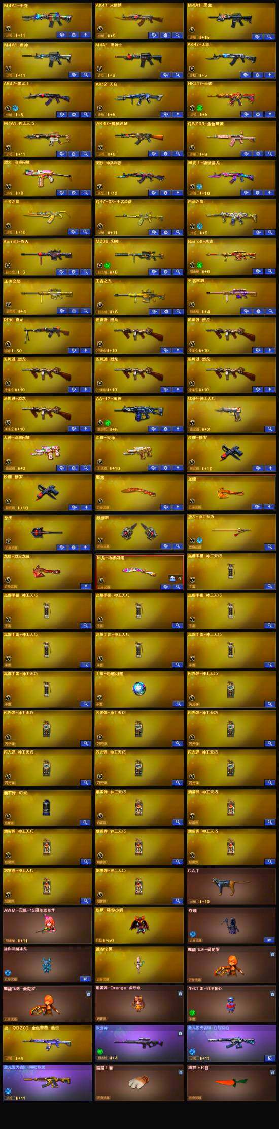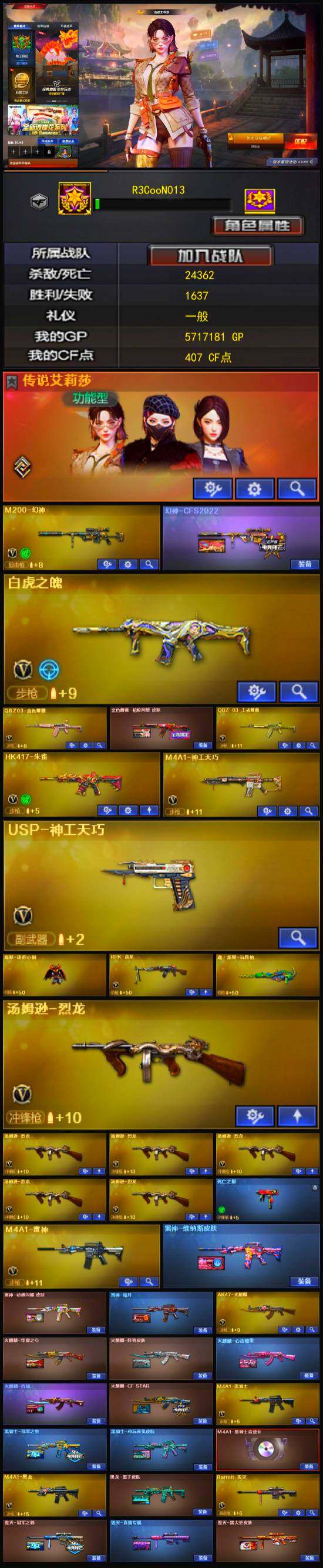 【热门武器】:QBZ03-金色蔷薇,HK417-朱雀,M200-幻神,死亡之眼,金色小号,C.A.T,炼狱-迷你小钢,M4A1-黑骑士,汤姆逊-烈龙*6,RPK-盘龙,火麒麟-绝迹,COP-白鲨,沙鹰-修罗*2,金刚伞