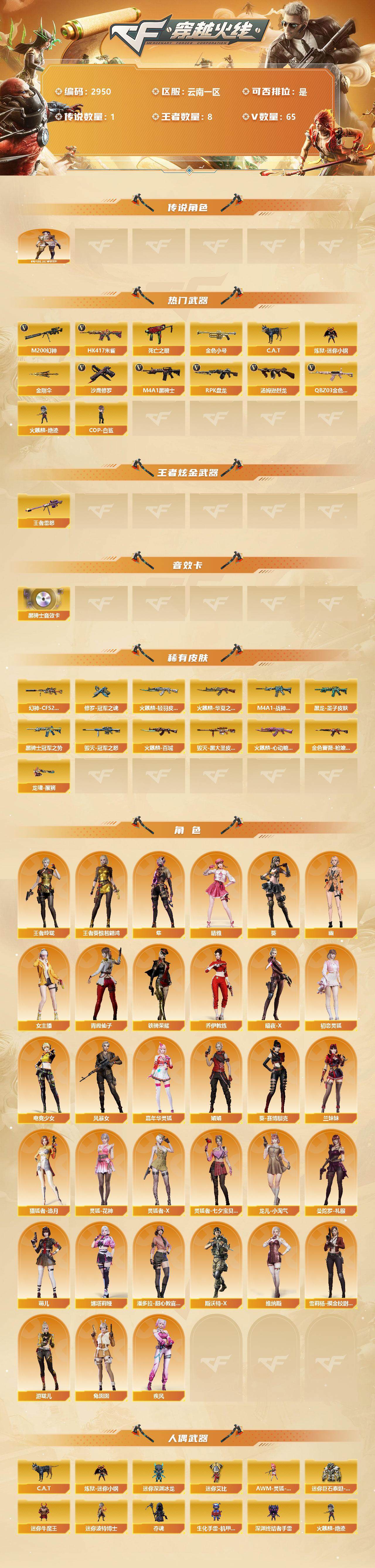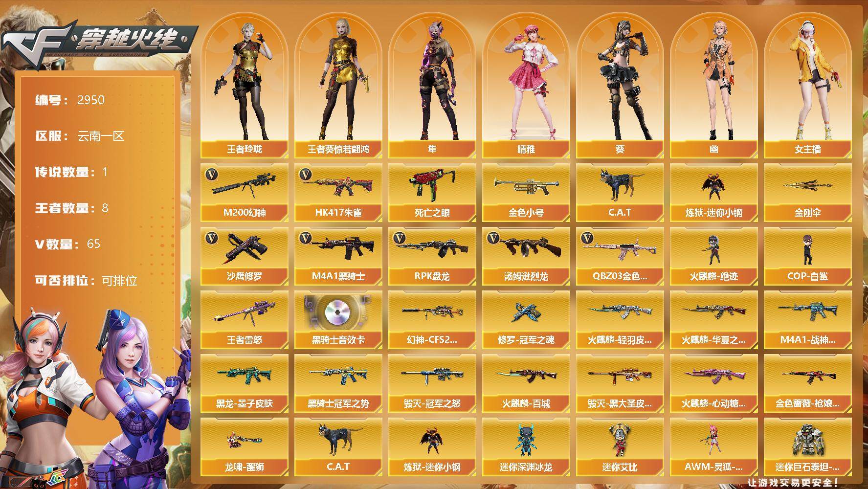 [13882386]云南一区-65V-8王者-0炫金 【传说角色】:传说艾莉莎 【热门武器】:QBZ03-金色蔷薇,HK417-朱雀,M200-幻神,死亡之眼,金色小号,C.A.T,炼狱-迷你小钢,M4A1-黑骑士,汤姆逊-烈龙*6,RPK-盘龙,火麒麟-绝迹,COP-白鲨,沙鹰-修罗*2,金刚伞 【王者炫金武器】:王者雷怒 【音效卡】:M4A1-黑骑士音效卡 【皮肤】:幻神-CFS2022,金色蔷薇-枪娘阿敏 皮肤,雷神-暗月,M4A1-战神赵云,雷神-维纳斯皮肤,雷神-动感闪耀 皮肤,火麒麟-雷神,火麒麟-华夏之心,火麒麟-轻羽皮肤,火麒麟-百城,火麒麟-心动糖果,毁灭-冠军之怒,毁灭-黑大圣皮肤,M4A1-千变-孔明皮肤,黑龙-墨子皮肤,黑骑士-冠军之势,黑骑士-电玩青兔皮肤,无影-神兵利器 皮肤,烈火-动感闪耀 皮肤,修罗-冠军之魂,龙啸-醒狮 皮肤,麒麟刺-甜蜜糖果 皮肤 【角色】:葵,晴雅,隼,王者葵-惊若翩鸿,王者玲珑,乔伊教练,暗夜-X,初恋灵狐,电竞少女,风暴女,嘉年华灵狐,疾风,娟娟,葵-赛博朋克,兰妹妹,猎狐者-追月,灵狐-花神,灵狐者-X,灵狐者-七夕宝贝,龙儿-小淘气,曼陀罗-礼服,萌儿,娜塔莉娅,女主播,潘多拉-甜心教官,青霞仙子,斯沃特-X,铁骑荣耀,兔囡囡,维纳斯,雪莉杨-摸金校尉,幽,游珑儿 【人偶武器】:火麒麟-绝迹,COP-白鲨,炼狱-迷你小钢,AWM-灵狐-15周年嘉年华,C.A.T,迷你艾比,迷你巨石泰坦-魔花研究所,迷你深渊冰龙,迷你牛魔王,迷你波特博士,夺魂,生化手雷-机甲核心,深渊终结者手雷*2 【暴走生化】:炼狱-迷你小钢,KAC-狂怒咆哮,黑龙吞噬者,双面神,死亡之眼,超级对讲机 【挑战大师】:冰龙粉碎者-白马银枪,激光毁灭者III-白马银枪,神圣爆裂者-末日III 【英雄级武器】:M4A1-千变,AK47-火麒麟,M4A1-黑龙,M4A1-雷神,M4A1-黑骑士,AK47-无影,AK47-黑武士,AK12-天启,AK47-机械迷城,HK417-朱雀,M4A1-神工天巧,无影-神兵利器,黑武士-锦绣游龙,QBZ03-金色蔷薇,烈火-动感闪耀,王者之鲨-觉醒版,QBZ-03-王者蔷薇-觉醒版,白虎之魄-觉醒版,Barrett-毁灭,M200-幻神,Barrett-朱雀,王者之怒-觉醒版,王者之光-觉醒版,RPK-盘龙,汤姆逊-烈龙*6
