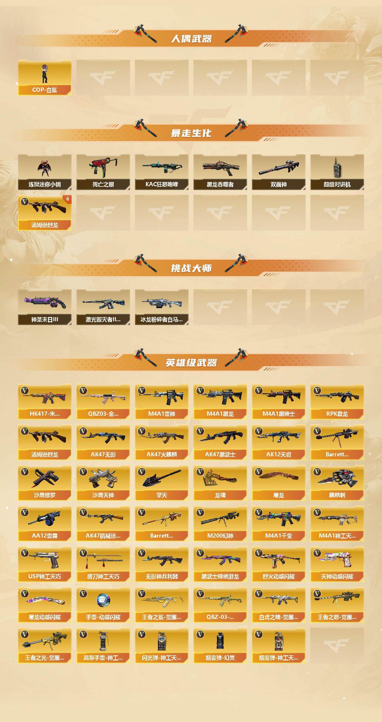 【英雄级武器】:M4A1-千变,AK47-火麒麟,M4A1-黑龙,M4A1-雷神,M4A1-黑骑士,AK47-无影,AK47-黑武士,AK12-天启,AK47-机械迷城,HK417-朱雀,M4A1-神工天巧,无影-神兵利器,黑武士-锦绣游龙,QBZ03-金色蔷薇,烈火-动感闪耀,王者之鲨-觉醒版,QBZ-03-王者蔷薇-觉醒版,白虎之魄-觉醒版,Barrett-毁灭,M200-幻神,Barrett-朱雀,王者之怒-觉醒版,王者之光-觉醒版,RPK-盘龙,汤姆逊-烈龙*6