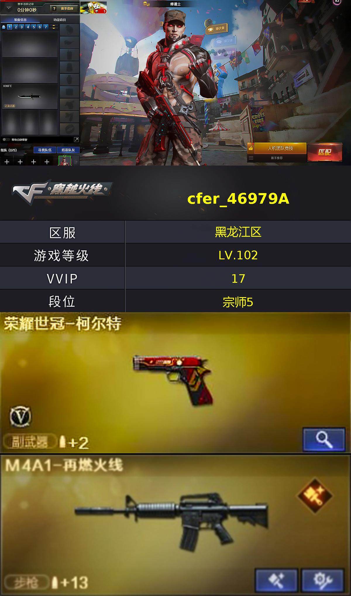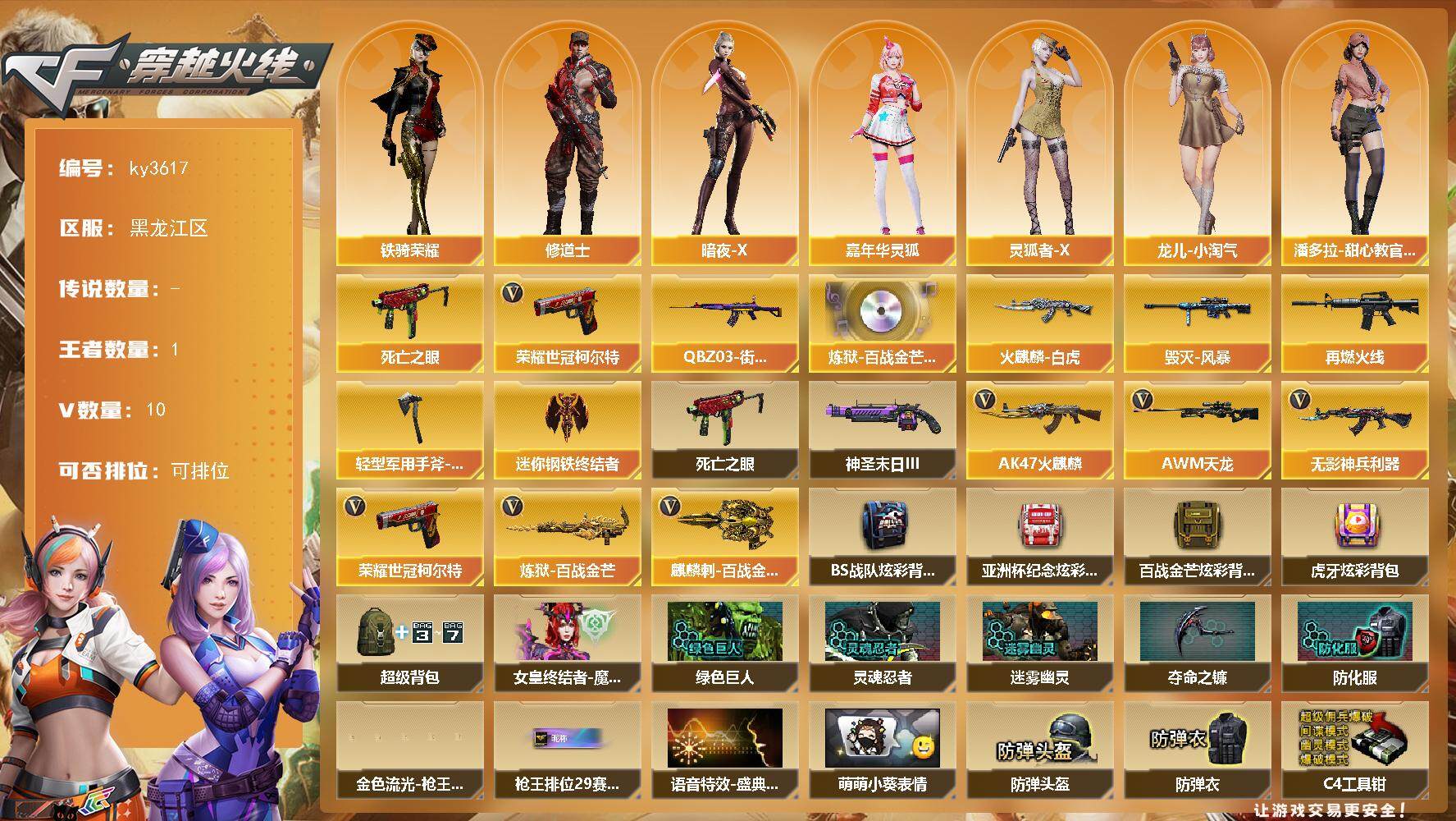 [13882467]黑龙江区-10V-1王者-0炫金 【热门武器】:死亡之眼,QBZ03-街机,荣耀世冠-柯尔特 【音效卡】:炼狱-百战金芒-庆典舞曲音效卡 【皮肤】:M4A1-再燃火线,火麒麟-白虎,毁灭-风暴,轻型军用手斧-再燃火线 【角色】:修道士,暗夜-X,嘉年华灵狐,灵狐者-X,龙儿-小淘气,潘多拉-甜心教官,铁骑荣耀 【人偶武器】:迷你钢铁终结者 【暴走生化】:死亡之眼 【挑战大师】:神圣爆裂者-末日III 【英雄级武器】:AK47-火麒麟,无影-神兵利器,AWM-天龙,炼狱-百战金芒,荣耀世冠-柯尔特,麒麟刺-百战金芒 【道具】:BS战队炫彩背包,亚洲杯纪念炫彩背包,百战金芒炫彩背包,虎牙炫彩背包,超级背包,女皇终结者-魔龙之吻,绿色巨人,灵魂忍者,迷雾幽灵,夺命之镰,防化服*3,金色流光-枪王排位,枪王排位29赛季金色流光,语音特效-盛典烟火,萌萌小葵表情,EP战队名片,防弹头盔*7,防弹衣*7,C4工具钳*7,手雷包*7 【特殊枪械】: