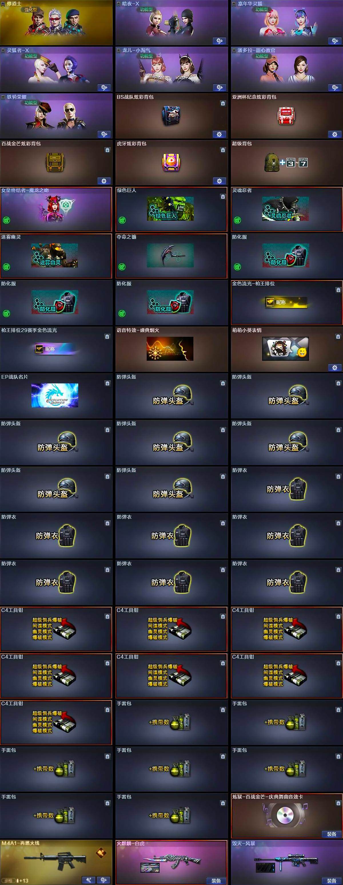【道具】:BS战队炫彩背包,亚洲杯纪念炫彩背包,百战金芒炫彩背包,虎牙炫彩背包,超级背包,女皇终结者-魔龙之吻,绿色巨人,灵魂忍者,迷雾幽灵,夺命之镰,防化服*3,金色流光-枪王排位,枪王排位29赛季金色流光,语音特效-盛典烟火,萌萌小葵表情,EP战队名片,防弹头盔*7,防弹衣*7,C4工具钳*7,手雷包*7