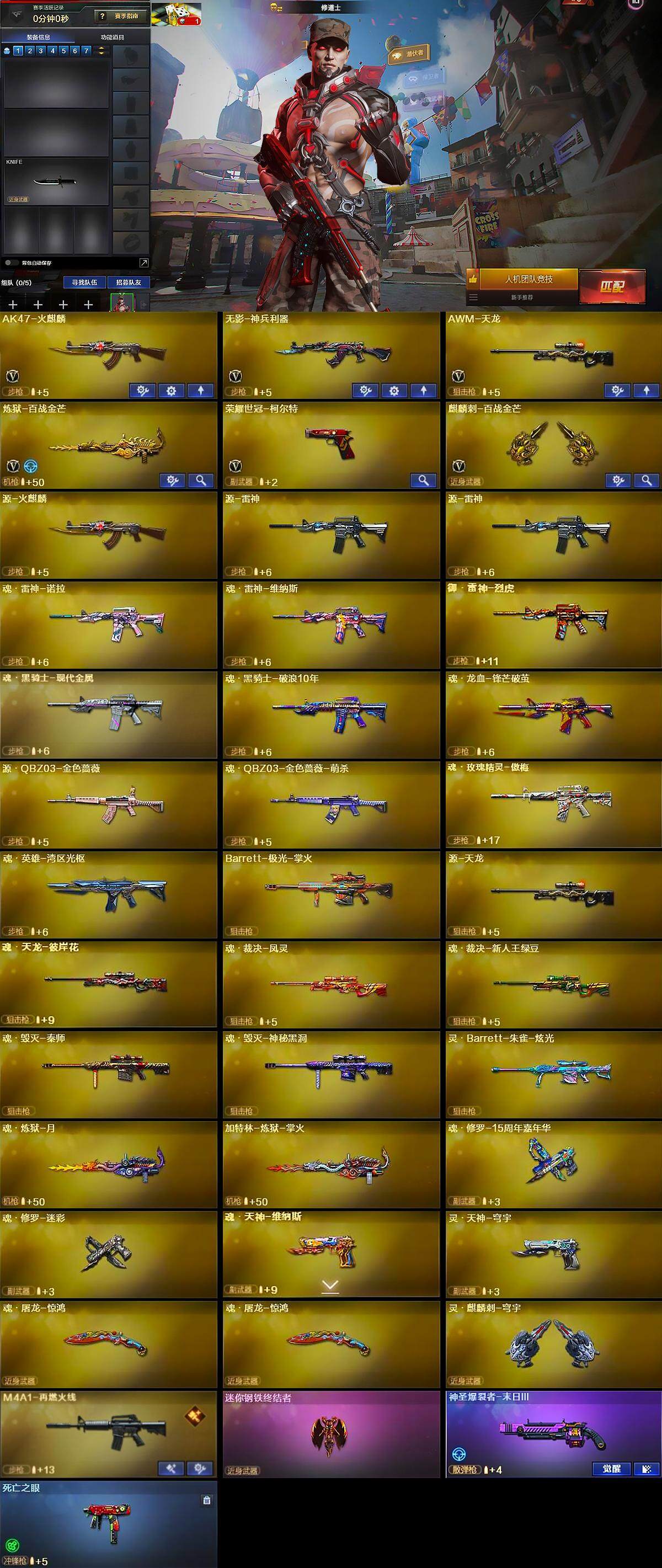 【英雄级武器】:AK47-火麒麟,无影-神兵利器,AWM-天龙,炼狱-百战金芒,荣耀世冠-柯尔特,麒麟刺-百战金芒