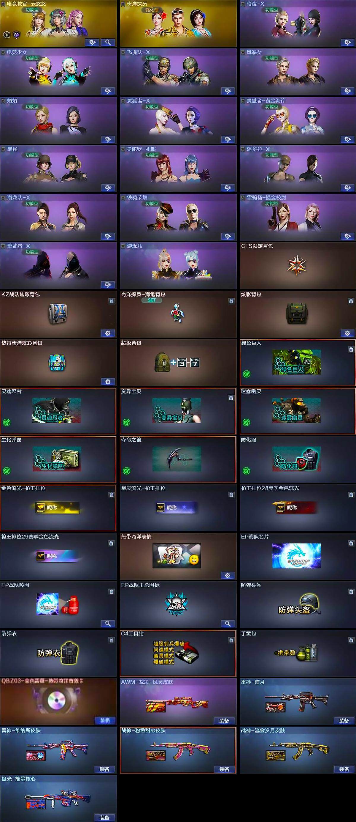【道具】:CFS限定背包,KZ战队炫彩背包,奇洋探员-海龟背包,炫彩背包,热带奇洋炫彩背包,超级背包,绿色巨人,灵魂忍者,变异宝贝,迷雾幽灵,生化弹匣,夺命之镰,防化服,金色流光-枪王排位,星辰流光-枪王排位,枪王排位28赛季金色流光,枪王排位29赛季金色流光,热带奇洋表情,EP战队名片,EP战队喷图,EP战队击杀图标,防弹头盔,防弹衣,C4工具钳,手雷包