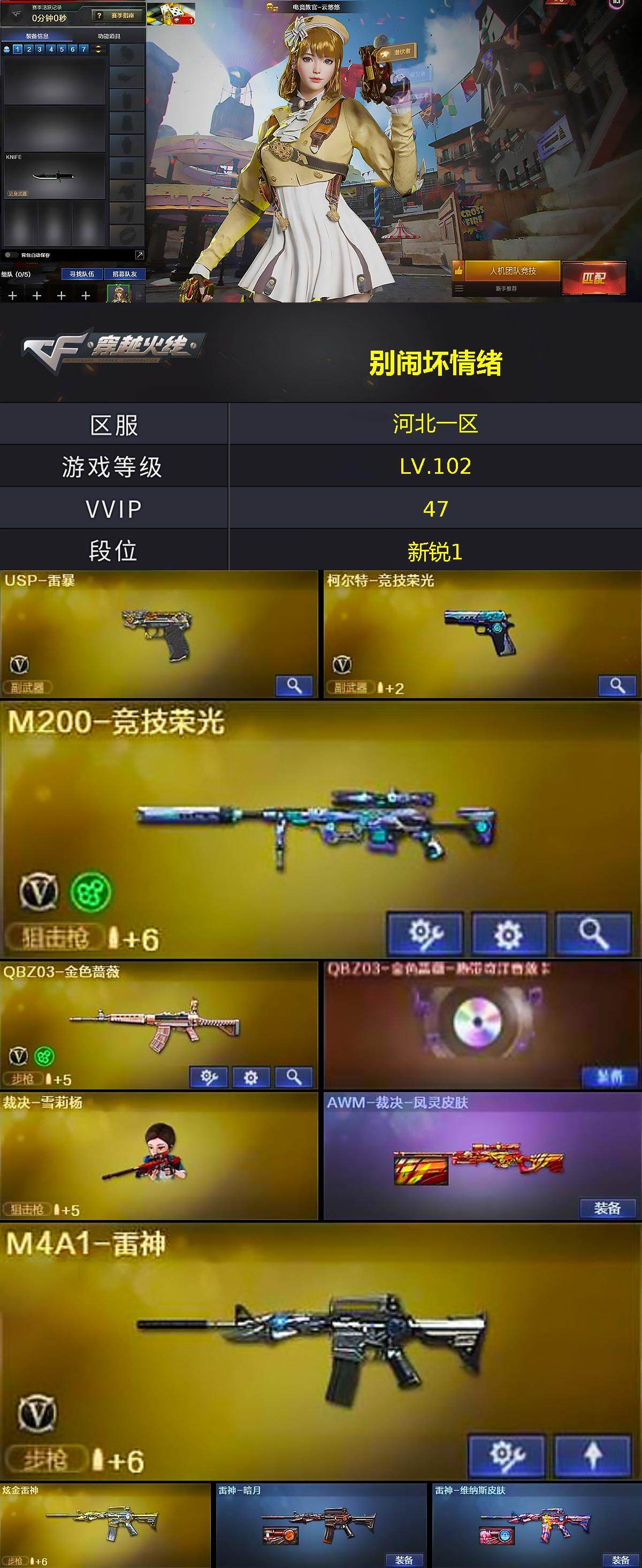 [13883406]河北一区-44V-7王者-2炫金 【热门武器】:QBZ03-金色蔷薇,M200-竞技荣光,羊驼玩偶,裁决-雪莉杨,USP-雷暴,金刚伞 【王者炫金武器】:炫金千变,炫金雷神 【音效卡】:QBZ03-金色蔷薇-热带奇洋音效卡 【皮肤】:AWM-裁决-凤灵皮肤,雷神-暗月,雷神-维纳斯皮肤,战神-粉色甜心皮肤,战神-流金岁月皮肤,AK47-B-常胜将军-曹操,AK47-B-常胜将军-刘备*2,AK47-B-常胜将军-孙权,极光-能量核心 【角色】:电竞教官-云悠悠,奇洋探员,暗夜-X,电竞少女,飞虎队-X,风暴女,娟娟,0号玩家,灵狐者-X,灵狐者-黄金海岸,麻雀,曼陀罗-礼服,潘多拉-X,潜龙队-X,邱刚敖,赛斯-X,铁骑荣耀,兔囡囡,雪莉杨-摸金校尉,影武者-X,游珑儿 【人偶武器】:裁决-雪莉杨,迷你深渊冰龙,深渊终结者手雷,闪光弹-小乔,闪光弹-貂蝉,高爆手雷-大乔,迷你艾比,灵狐娃娃手雷 【暴走生化】:超级对讲机 【挑战大师】:激光毁灭者III,神圣爆裂者-末日III 【英雄级武器】:M4A1-雷神,黑武士-锦绣游龙,超新星-热带奇洋,QBZ03-金色蔷薇,王者之势-觉醒版,AK-47-猩红传说,黑骑士-海王*2,AK47-B-常胜将军,M4A1-雷霆王者-觉醒版,Barrett-极光,M200-竞技荣光,王者之光-觉醒版,沙鹰-天神,USP-雷暴,柯尔特-竞技荣光,屠龙,擎天*2,擎天-竞技荣光,龙啸-热带奇洋,王者之击-觉醒版,高爆手雷-竞技荣光*8,手雷-热带奇洋,闪光弹-竞技荣光*7,烟雾弹-竞技荣光*8 【道具】:CFS限定背包,KZ战队炫彩背包,奇洋探员-海龟背包,炫彩背包,热带奇洋炫彩背包,超级背包,绿色巨人,灵魂忍者,变异宝贝,迷雾幽灵,生化弹匣,夺命之镰,防化服,金色流光-枪王排位,星辰流光-枪王排位,枪王排位28赛季金色流光,枪王排位29赛季金色流光,热带奇洋表情,EP战队名片,EP战队喷图,EP战队击杀图标,防弹头盔,防弹衣,C4工具钳,手雷包 【特殊枪械】: