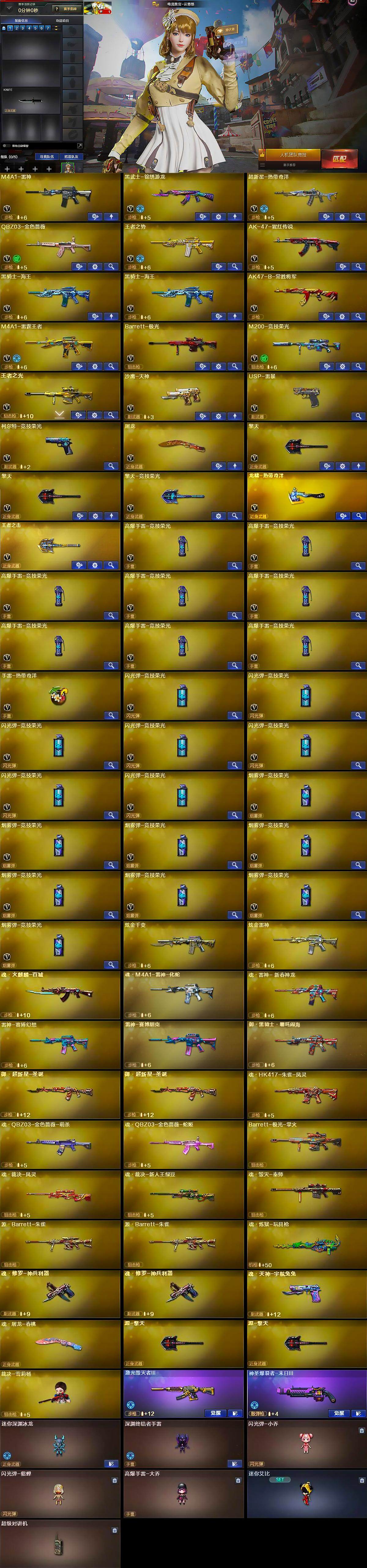 - [12233738]30粉装 25特效枪 3载具 29印记 可二次 可修改实名 身法装备:暗影哥特(红眼罩),8号机(新粉螳螂),Mark.06(新蓝螳螂),巡查衣(绝对防御上衣) 优质装备:玛莎拉蒂Ghibli(粉),合金龙骨(绿),巡查员衣服(绝对防御上衣),九级M416-至情至圣(满级至情至圣M416),巡查衣(绝对防御上衣),MG3洛神天依,M24星之信仰,M416心之恋语,奇异狩猎者,蝶舞迷情,极限特训,深海曼妙,宝贝奶油派,天使彩虹糖,银河战甲,金曜白虎,向日葵(套装-向日葵先生),香水柠檬,PEL轰鸣竞梦者,炙焰红王,冰霜白皇,俏皮狐尾,AUG星之彼岸,汤姆逊怪笑疯兔,AKM梦之光华,DP-28枪炮玫瑰,洛天依,SCAR-L青春物语,UMP45恐龙拽拽,UZI筑梦精灵,M24翩跹演武,M416至情至圣,M417第五大道,AKM绿萝繁花,P90沙丘之主,M249猪猪侠,M24镜域双华,PKM江南烟雨,七级UMP45-恐龙拽拽,七级AKM-梦之光华,七级汤姆逊-怪笑疯兔,Mk14精灵梦叶罗丽,M416墨龙九天,M200梦海之灵,狂花道·不知火舞,MK14-盛世惊鸿,幻影飞狐,AMR-智耀战神,Kar98K-巳巳如意 热门装扮:飓风飞鹰,黑伞漫漫,酣梦娃娃,筑梦精灵,霞光圣骑,寒光使者,复仇流浪者,冰川红玫,仲夏莫吉托,呆萌星弥,暗夜玫瑰,猪猪侠,烟云彩露,美琪,光极星,奶芙汪汪,恶魔喵喵,迅捷狂鲨,万圣娃娃,梦魇先生,深海小丑鱼,东方飞龙,浪漫波比,好奇恐龙,暗夜魅影 载具:鬼马风驰 稀有枪皮:DP-28-豹影疾电 五级特效枪:五级Kar98K-巳巳如意,五级AKM-绿萝繁花,五级DP-28-枪炮玫瑰 四级特效枪:四级M24-星之信仰,四级Mk14-精灵梦叶罗丽,四级AMR-智耀战神,四级AUG-星之彼岸,四级M249-猪猪侠,四级MG3-洛神天依,四级SCAR-L-青春物语,四级UZI-筑梦精灵 三级特效枪:三级M200-梦海之灵,三级MK14-盛世惊鸿,三级P90-沙丘之主,三级M24-镜域双华 二级特效枪:二级M416-墨龙九天,二级PKM-江南烟雨 一级特效枪:一级M416-心之恋语,一级DP-28-豹影疾电,一级M417-第五大道,一级M24-翩跹演武 紫色装扮:幻彩翩翩,SS23特训,妙红点点,极速光影,SS30特训套装,SS31特训套装,SS33特训套装,青
