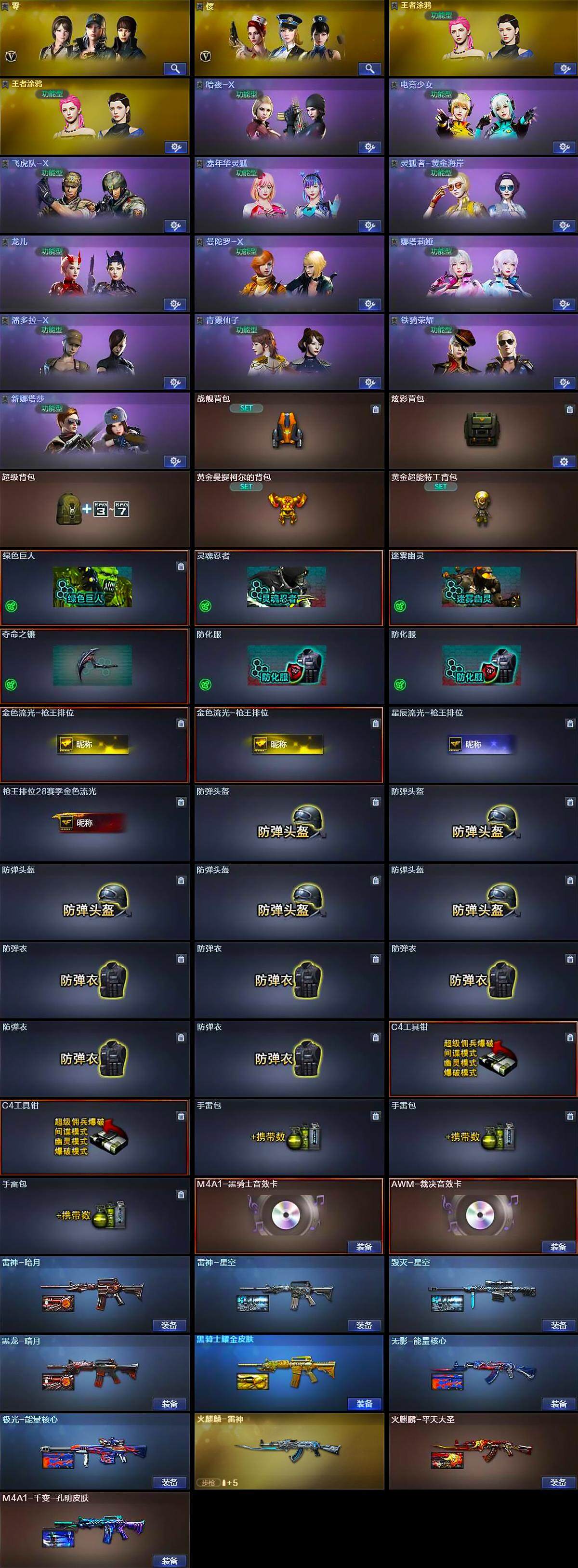 【道具】:战舰背包,炫彩背包,超级背包,黄金曼提柯尔的背包,黄金超能特工背包,绿色巨人,灵魂忍者,迷雾幽灵,夺命之镰,防化服*2,金色流光-枪王排位*2,星辰流光-枪王排位,枪王排位28赛季金色流光,防弹头盔*5,防弹衣*5,C4工具钳*2,手雷包*3