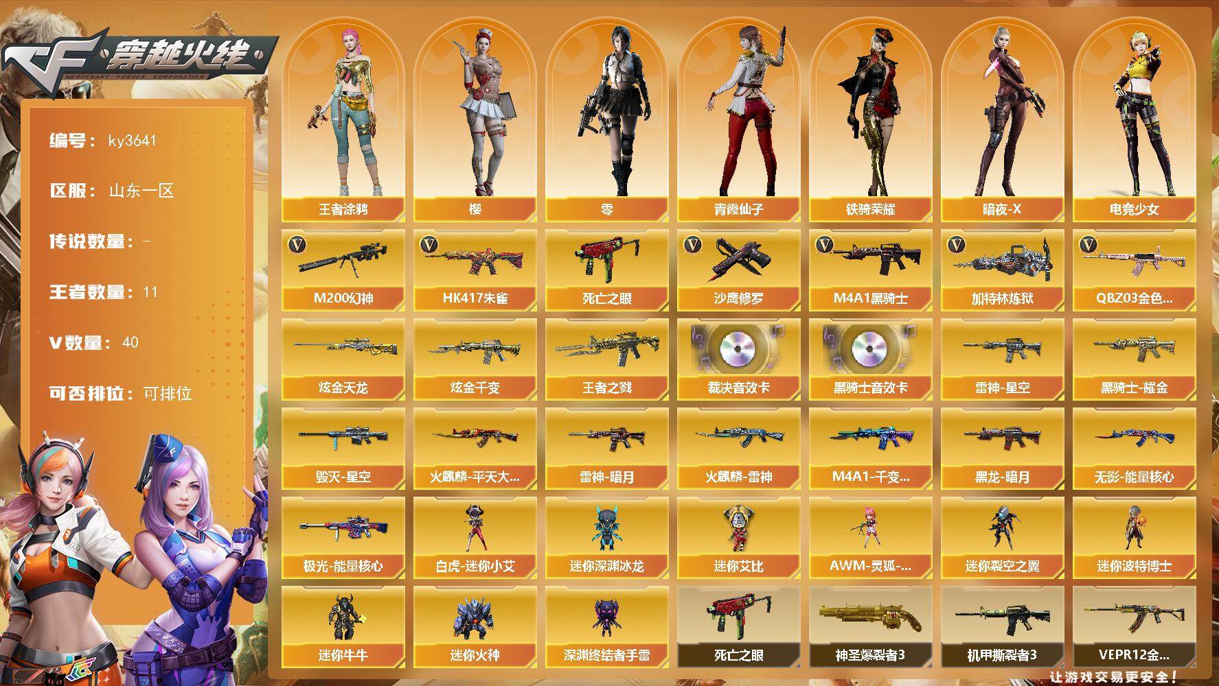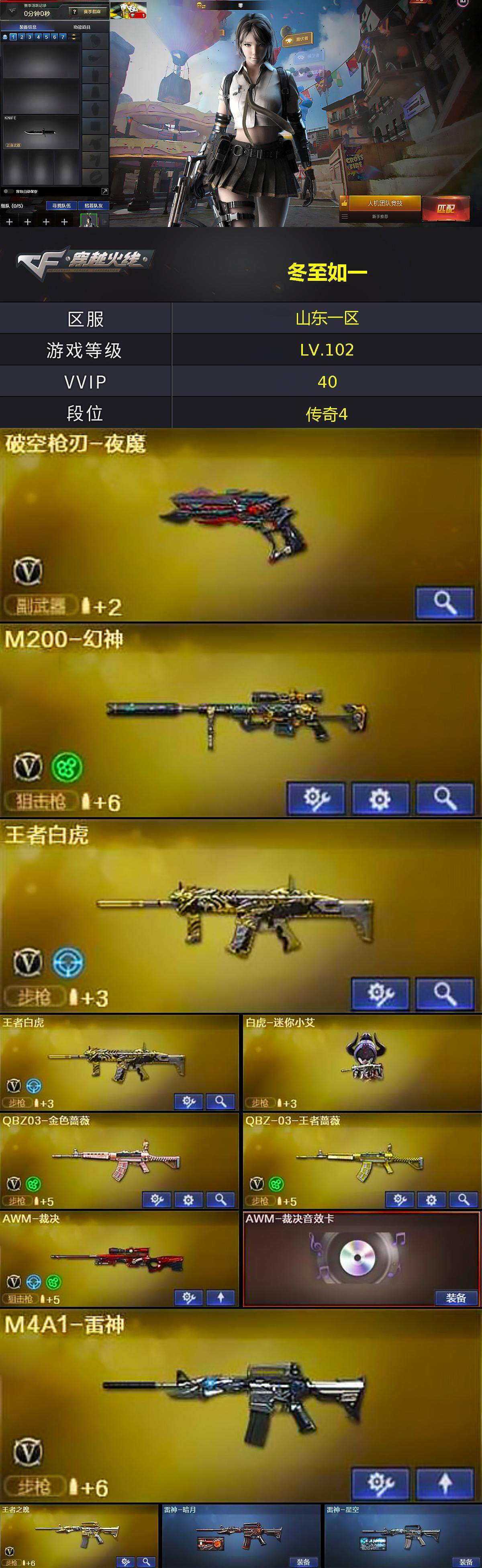 [13883812]山东一区-40V-11王者-2炫金 【热门武器】:QBZ03-金色蔷薇,HK417-朱雀,M200-幻神,死亡之眼,M4A1-黑骑士,加特林-炼狱*3,沙鹰-修罗*2 【王者炫金武器】:王者之戮,炫金千变,炫金天龙 【音效卡】:M4A1-黑骑士音效卡,AWM-裁决音效卡 【皮肤】:雷神-暗月,雷神-星空,火麒麟-雷神,火麒麟-平天大圣,毁灭-星空,M4A1-千变-孔明皮肤,黑龙-暗月,黑骑士耀金皮肤,无影-能量核心,极光-能量核心 【角色】:零,樱,王者涂鸦*2,暗夜-X,电竞少女,飞虎队-X,嘉年华灵狐,灵狐者-黄金海岸,龙儿,曼陀罗-X,娜塔莉娅,潘多拉-X,青霞仙子,铁骑荣耀,兔囡囡,新娜塔莎 【人偶武器】:白虎-迷你小艾,AWM-灵狐-15周年嘉年华,迷你深渊冰龙,迷你裂空之翼*2,迷你波特博士*2,迷你牛牛,迷你火种,深渊终结者手雷,迷你艾比 【暴走生化】:死亡之眼 【挑战大师】:神圣爆裂者III*2,激光毁灭者III-白马银枪*2,VEPR-12-金魔*2,激光毁灭者III*2,机甲撕裂者III,试炼破坏者III,阐释者III 【英雄级武器】:AK47-火麒麟,M4A1-黑龙,M4A1-雷神,M4A1-黑骑士,AK47-无影,AK47-机械迷城,AK47-黑鲨,HK417-朱雀,无影-神兵利器,黑武士-锦绣游龙,QBZ03-金色蔷薇,王者之魄-觉醒版,超新星-悦享-觉醒版,王者白虎-觉醒版*2,QBZ-03-王者蔷薇-觉醒版,黑武士-CF网剧冠军,Barrett-毁灭*2,Barrett-极光,AWM-裁决,M200-幻神,Barrett-朱雀,加特林-炼狱*3,AA-12-雷霆,沙鹰-修罗*2,沙鹰-天神,破空枪刃-夜魔,王者之灵-觉醒版*2,天神-CF网剧冠军,屠龙,龙啸,马来剑-夜魔,麒麟刺,擎天-CF网剧冠军,王者之锋-觉醒版,高爆手雷-夜魔*2,闪光弹-夜魔*2,烟雾弹-夜魔*2 【道具】:战舰背包,炫彩背包,超级背包,黄金曼提柯尔的背包,黄金超能特工背包,绿色巨人,灵魂忍者,迷雾幽灵,夺命之镰,防化服*2,金色流光-枪王排位*2,星辰流光-枪王排位,枪王排位28赛季金色流光,防弹头盔*5,防弹衣*5,C4工具钳*2,手雷包*3 【特殊枪械】:1黑骑士,3炼狱