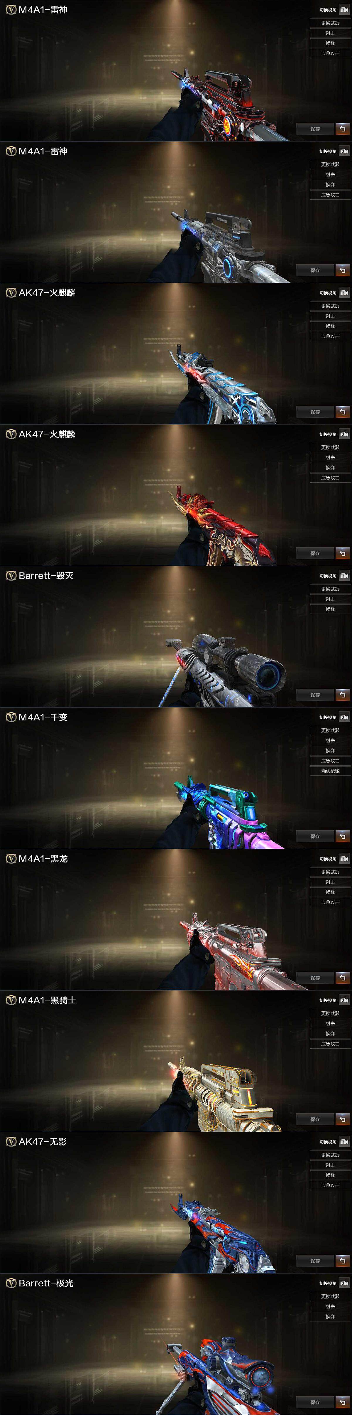 【英雄级武器】:AK47-火麒麟,M4A1-黑龙,M4A1-雷神,M4A1-黑骑士,AK47-无影,AK47-机械迷城,AK47-黑鲨,HK417-朱雀,无影-神兵利器,黑武士-锦绣游龙,QBZ03-金色蔷薇,王者之魄-觉醒版,超新星-悦享-觉醒版,王者白虎-觉醒版*2,QBZ-03-王者蔷薇-觉醒版,黑武士-CF网剧冠军,Barrett-毁灭*2,Barrett-极光,AWM-裁决,M200-幻神,Barrett-朱雀,加特林-炼狱*3,AA-12-雷霆,沙鹰-修罗*2,沙鹰-天神,破空枪刃-夜魔,王者之灵-觉醒版*2,天神-CF网剧冠军,屠龙,龙啸,马来剑-夜魔,麒麟刺,擎天-CF网剧冠军,王者之锋-觉醒版,高爆手雷-夜魔*2,闪光弹-夜魔*2,烟雾弹-夜魔*2