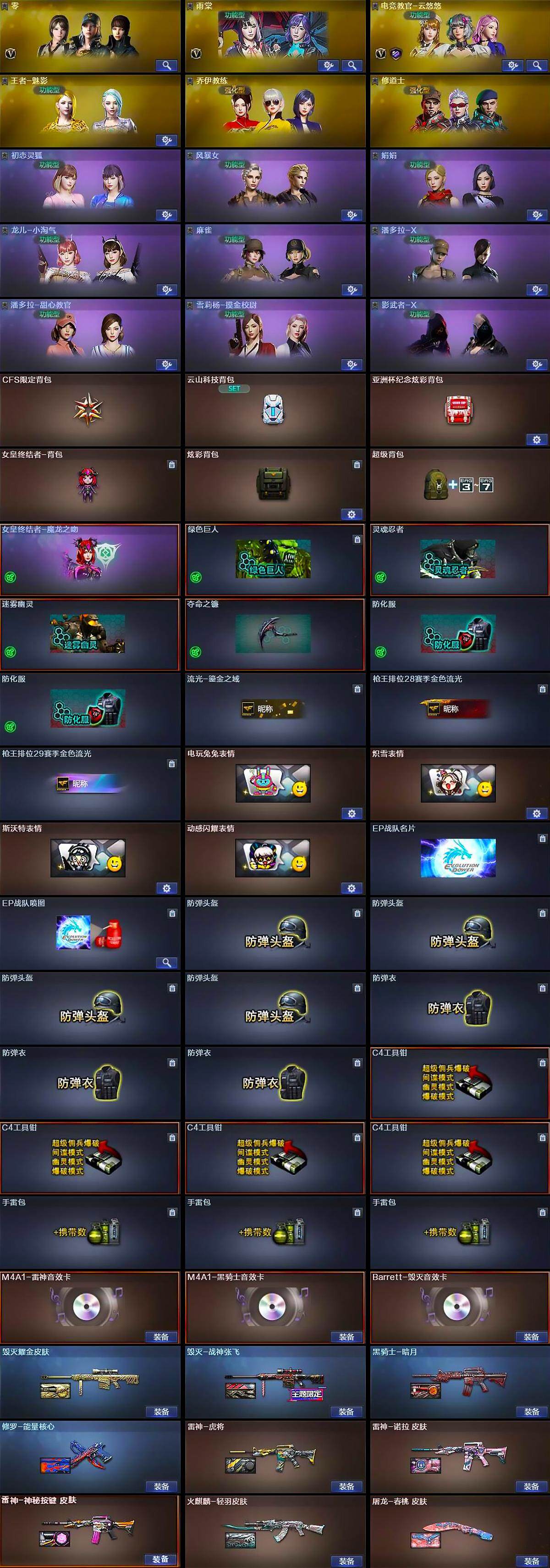 【道具】:CFS限定背包,云山科技背包,亚洲杯纪念炫彩背包,女皇终结者-背包,炫彩背包,超级背包,女皇终结者-魔龙之吻,绿色巨人,灵魂忍者,迷雾幽灵,夺命之镰,防化服*2,流光-鎏金之域,枪王排位28赛季金色流光,枪王排位29赛季金色流光,电玩兔兔表情,炽雪表情,斯沃特表情,动感闪耀表情,EP战队名片,EP战队喷图,防弹头盔*4,防弹衣*3,C4工具钳*4,手雷包*3