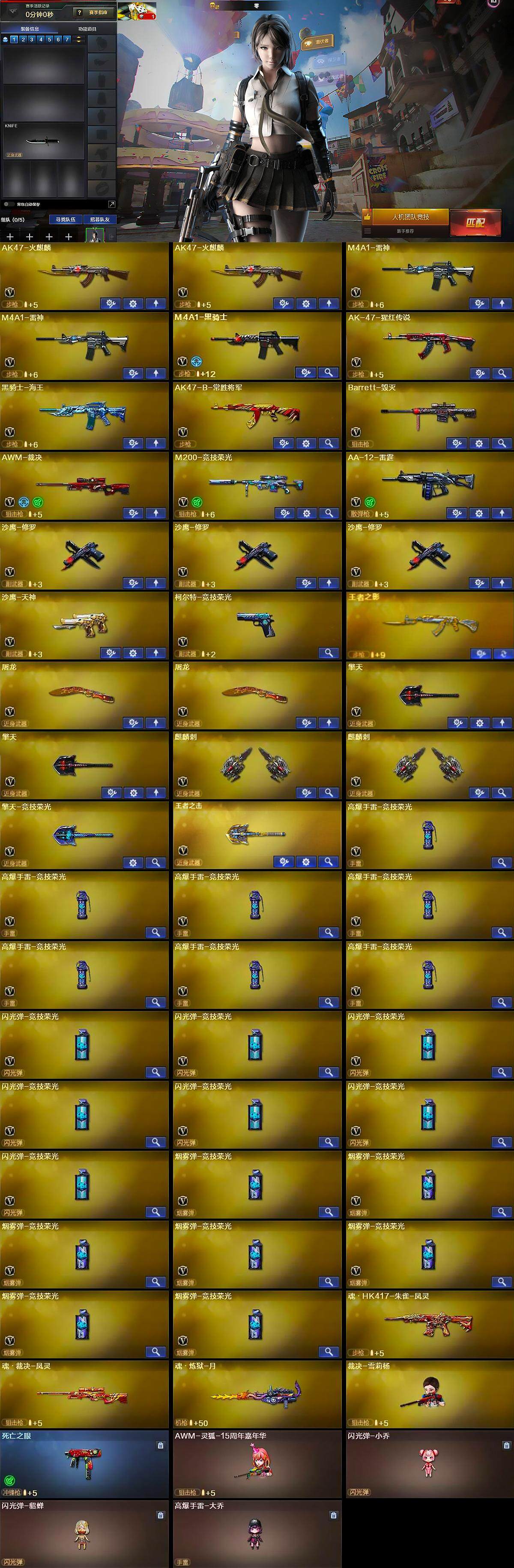 【英雄级武器】:AK47-火麒麟*2,M4A1-雷神*2,M4A1-黑骑士,AK-47-猩红传说,黑骑士-海王,AK47-B-常胜将军,Barrett-毁灭,AWM-裁决,M200-竞技荣光,AA-12-雷霆,沙鹰-修罗*3,沙鹰-天神,柯尔特-竞技荣光,屠龙*2,擎天*2,麒麟刺*2,擎天-竞技荣光,王者之击-觉醒版,高爆手雷-竞技荣光*7,闪光弹-竞技荣光*7,烟雾弹-竞技荣光*7