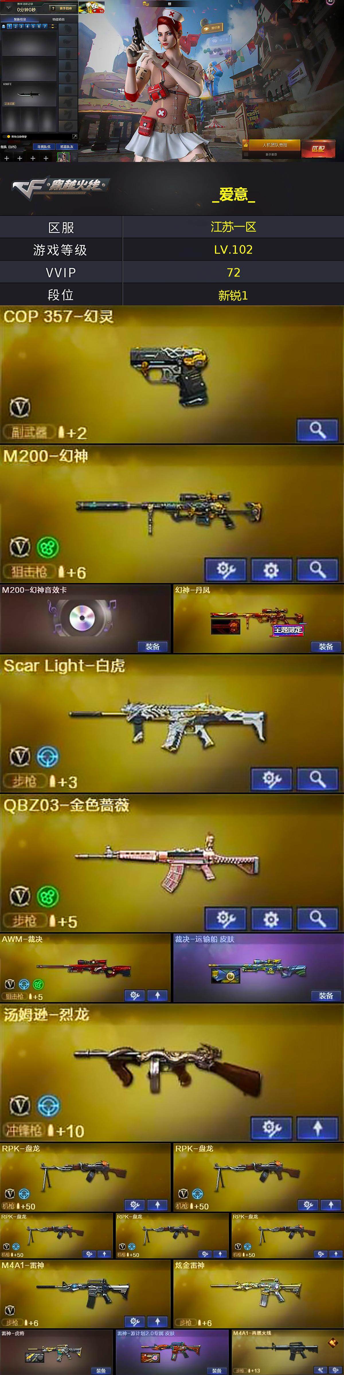 【热门武器】:QBZ03-金色蔷薇,Scar Light-白虎,M200-幻神,C.A.T,M4A1-黑骑士*4,汤姆逊-烈龙,RPK-盘龙*5,加特林-炼狱*2,斯泰尔-蝴蝶,COP 357-幻灵,沙鹰-修罗*3