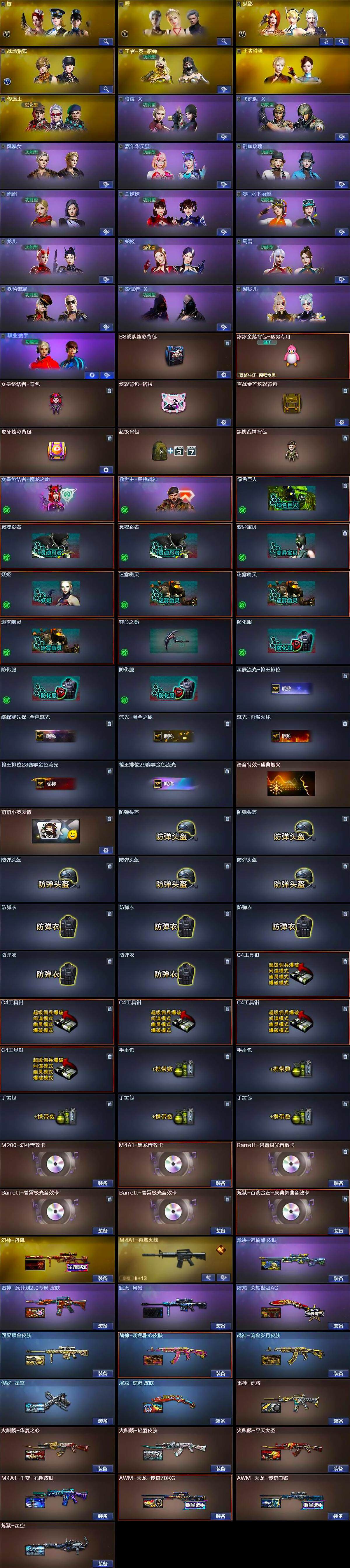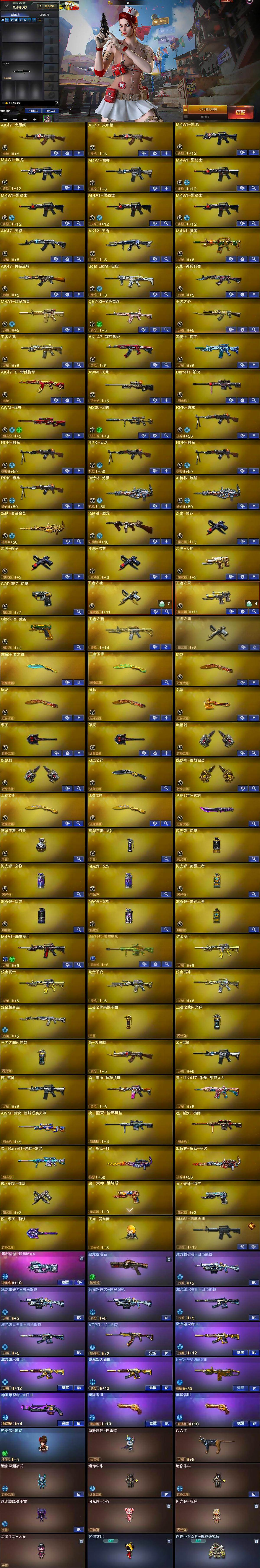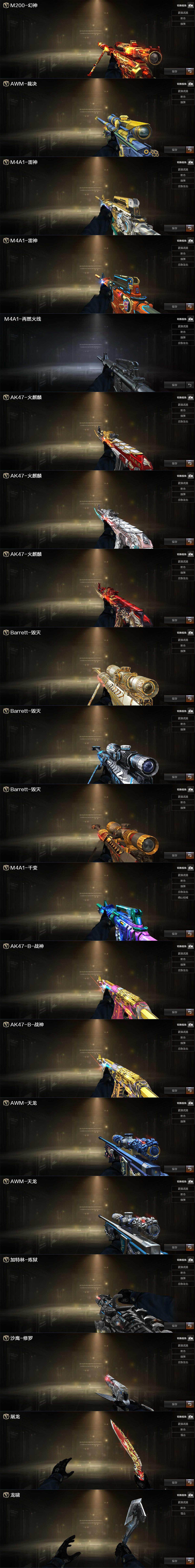 【英雄级武器】:AK47-火麒麟*2,M4A1-黑龙*2,M4A1-雷神,M4A1-黑骑士*4,AK47-无影,AK12-天启,M4A1-武圣,AK47-机械迷城,Scar Light-白虎,无影-神兵利器,QBZ03-独角-III,M4A1-玫瑰精灵,QBZ03-金色蔷薇,王者之心-觉醒版,王者之武-觉醒版,AK-47-猩红