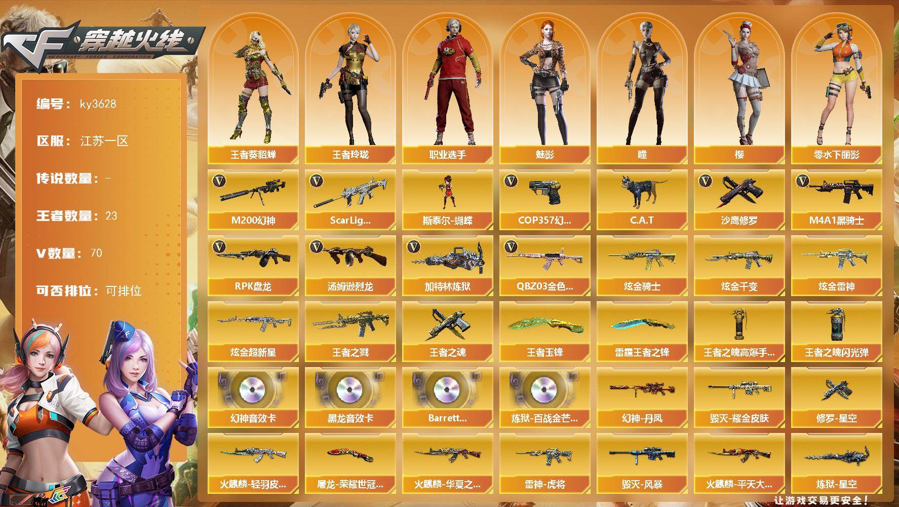 [13884270]江苏一区-70V-23王者-5炫金 【热门武器】:QBZ03-金色蔷薇,Scar Light-白虎,M200-幻神,C.A.T,M4A1-黑骑士*4,汤姆逊-烈龙,RPK-盘龙*5,加特林-炼狱*2,斯泰尔-蝴蝶,COP 357-幻灵,沙鹰-修罗*3 【王者炫金武器】:王者之戮,王者之魂,雷霆王者之锋,王者玉锋,炫金骑士*2,炫金千变,炫金雷神,炫金超新星,王者之魄高爆手雷,王者之魄闪光弹*2 【音效卡】:M200-幻神音效卡,M4A1-黑龙音效卡,Barrett-碧霄极光音效卡*3,炼狱-百战金芒-庆典舞曲音效卡 【皮肤】:幻神-丹凤,裁决-运输船 皮肤,雷神-虎将,雷神-源计划2.0专属 皮肤,M4A1-再燃火线,火麒麟-华夏之心,火麒麟-轻羽皮肤,火麒麟-平天大圣,毁灭耀金皮肤,毁灭-风暴,毁灭-英雄计划 皮肤,M4A1-千变-孔明皮肤,战神-粉色甜心皮肤,战神-流金岁月皮肤,AK47-B-常胜将军-曹操,AK47-B-常胜将军-孙权*2,AWM-天龙-传奇70KG,AWM-天龙-传奇白鲨,炼狱-星空,修罗-星空,屠龙-荣耀世冠AG,屠龙-惊鸿 皮肤,轻型军用手斧-再燃火线 【角色】:樱,瞳,魅影,战地猎狐,王者-葵-貂蝉,王者玲珑,修道士,暗夜-X,飞虎队-X,风暴女,嘉年华灵狐,荆棘玫瑰,娟娟,兰妹妹,零-水下丽影,龙儿,蛇姬,蜀雪,铁骑荣耀,影武者-X,游珑儿,职业选手 【人偶武器】:天龙-曼陀罗,斯泰尔-蝴蝶,海滩汪汪-巴雷特,C.A.T,迷你深渊冰龙,迷你牛牛*2,深渊终结者手雷,闪光弹-小乔,闪光弹-貂蝉,高爆手雷-大乔,迷你艾比,迷你巨石泰坦-魔花研究所,灵狐娃娃手雷*2 【暴走生化】:黑龙吞噬者 【挑战大师】:暴君乱世-超越Max,冰龙粉碎者-白马银枪*3,激光毁灭者III-白马银枪*2,VEPR-12-金魔,激光毁灭者III*3,KAC-圣炎切割者III,神圣爆裂者-末日III,阐释者III*2,VEPR-12-红魔 【英雄级武器】:AK47-火麒麟*2,M4A1-黑龙*2,M4A1-雷神,M4A1-黑骑士*4,AK47-无影,AK12-天启,M4A1-武圣,AK47-机械迷城,Scar Light-白虎,无影-神兵利器,QBZ03-独角-III,M4A1-玫瑰精灵,QBZ03-金色蔷薇,王者之心-觉醒版,王者之武-觉醒版,AK-47-猩红