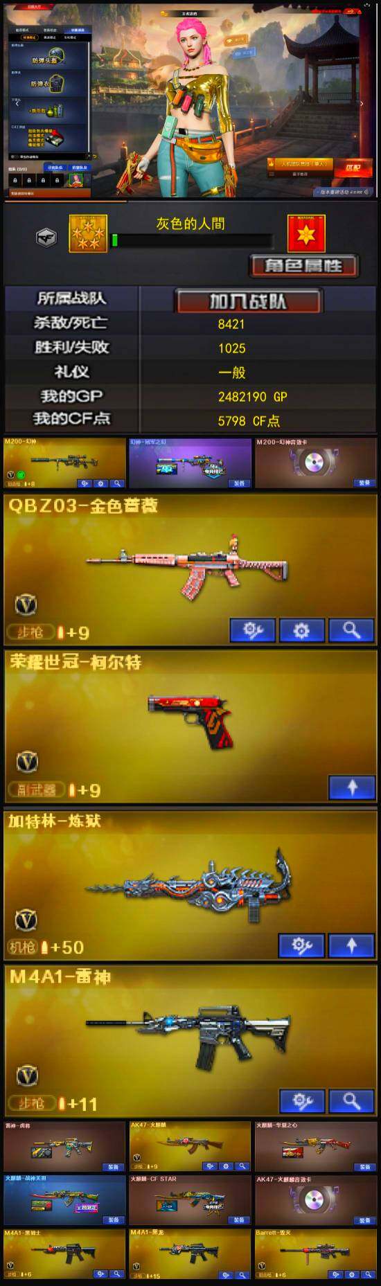 【热门武器】:QBZ03-金色蔷薇,M200-幻神,荣耀世冠-火麒麟,荣耀世冠-雷神,荣耀世冠-柯尔特,王者炎心,M4A1-黑骑士,加特林-炼狱,荣耀世冠-龙啸