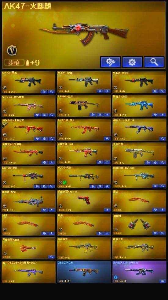 【英雄级武器】:AK47-火麒麟,M4A1-黑龙,M4A1-雷神,M4A1-黑骑士,QBZ03-金色蔷薇,AK-47-猩红传说,黑骑士-海王,AK47-B-常胜将军,王者之烈-觉醒版,荣耀世冠-火麒麟,荣耀世冠-雷神,Barrett-毁灭,M200-幻神,加特林-炼狱,荣耀世冠-柯尔特,屠龙*3,麒麟刺,荣耀世冠-龙啸