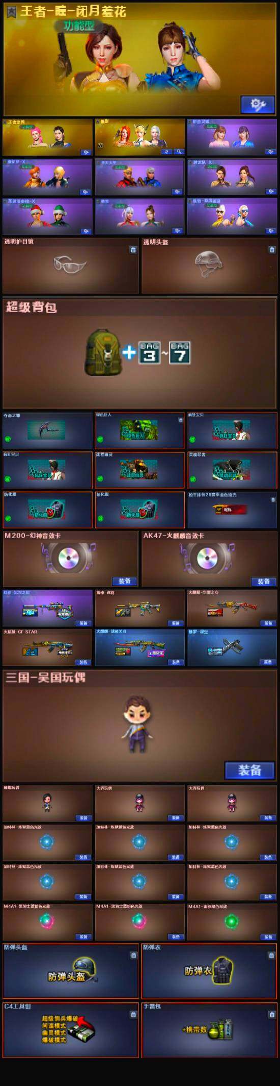 【皮肤】:幻神-冠军之幻,雷神-虎将,M4A1-战神赵云,火麒麟-华夏之心,火麒麟-战神关羽,M4A1-千变-孔明皮肤,战神-粉色甜心皮肤,战神-紫绶金章皮肤,战神-流金岁月皮肤*2,AK47-B-常胜将军-曹操,AK47-B-常胜将军-刘备*2,修罗-星空