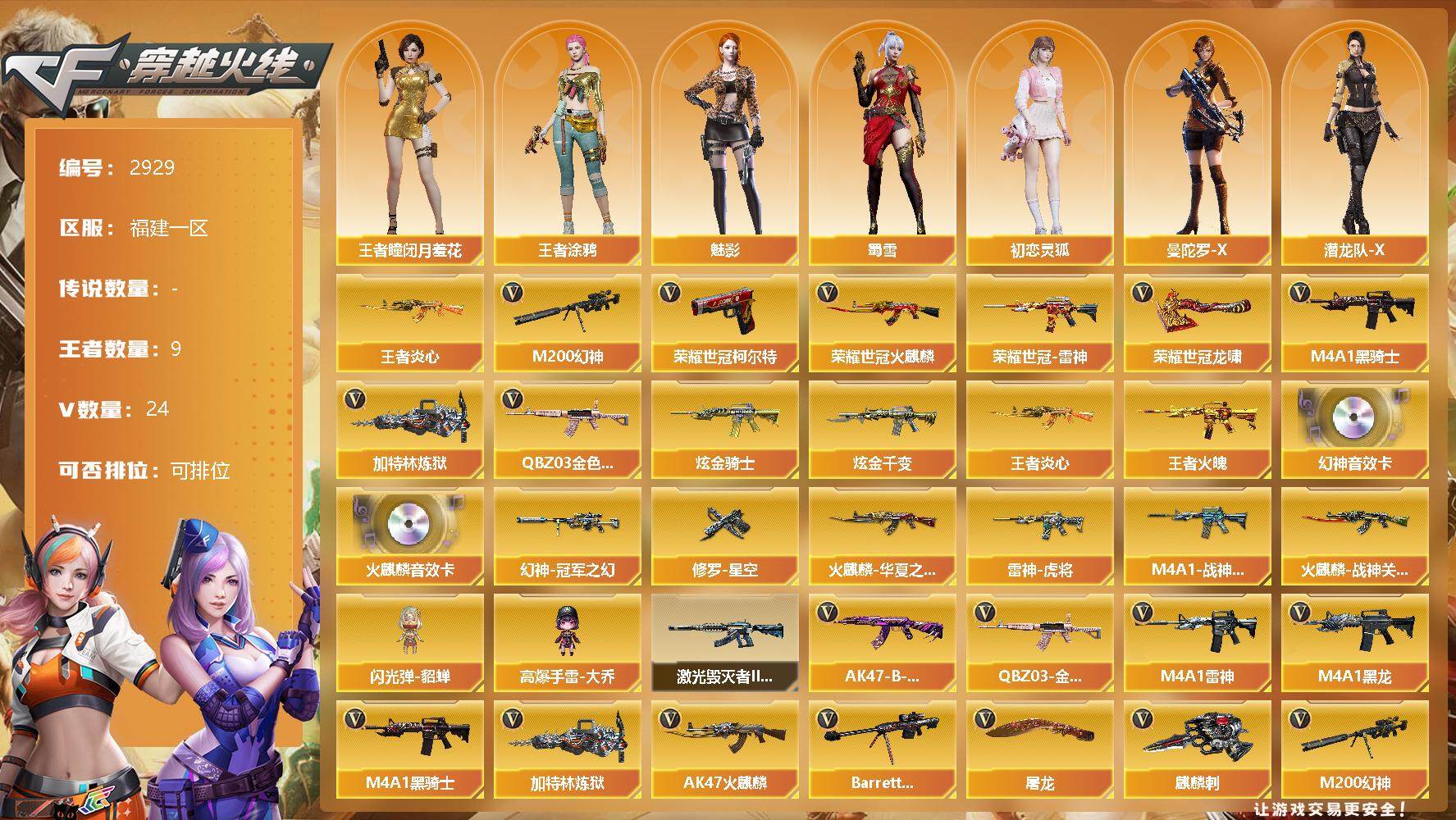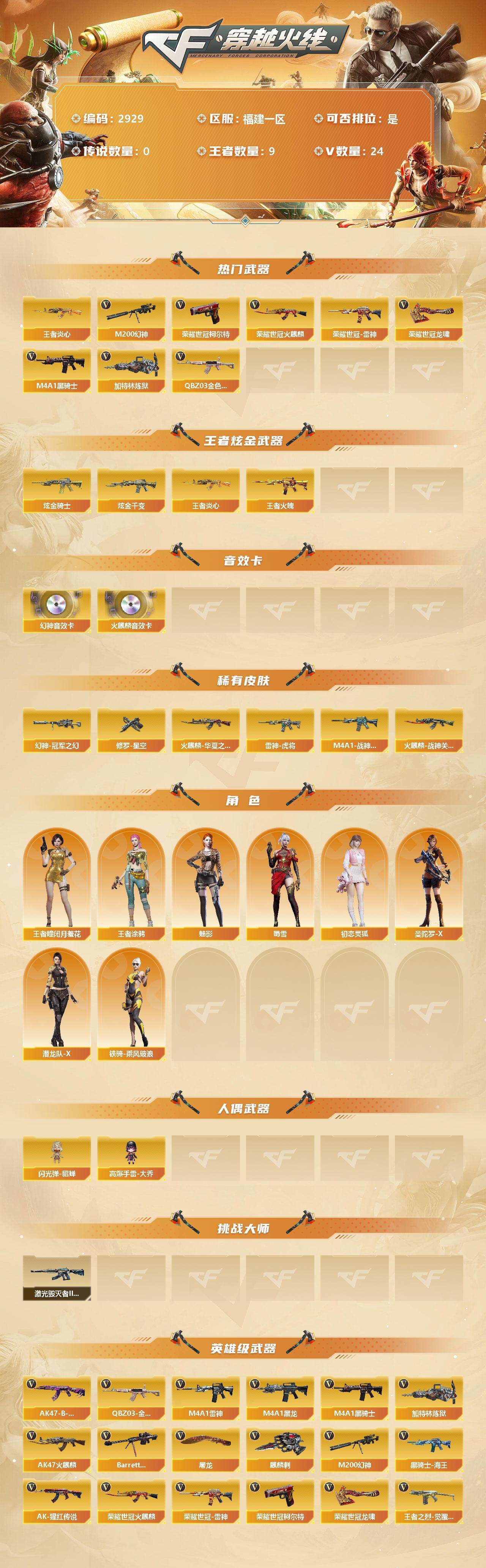 [13885057]福建一区-24V-9王者-2炫金 【热门武器】:QBZ03-金色蔷薇,M200-幻神,荣耀世冠-火麒麟,荣耀世冠-雷神,荣耀世冠-柯尔特,王者炎心,M4A1-黑骑士,加特林-炼狱,荣耀世冠-龙啸 【王者炫金武器】:王者炎心,王者火魄,炫金骑士,炫金千变 【音效卡】:M200-幻神音效卡,AK47-火麒麟音效卡 【皮肤】:幻神-冠军之幻,雷神-虎将,M4A1-战神赵云,火麒麟-华夏之心,火麒麟-战神关羽,M4A1-千变-孔明皮肤,战神-粉色甜心皮肤,战神-紫绶金章皮肤,战神-流金岁月皮肤*2,AK47-B-常胜将军-曹操,AK47-B-常胜将军-刘备*2,修罗-星空 【角色】:魅影,王者-瞳-闭月羞花,王者涂鸦,初恋灵狐,曼陀罗-X,潜龙队-X,蜀雪,铁骑-乘风破浪 【人偶武器】:闪光弹-貂蝉,高爆手雷-大乔 【挑战大师】:激光毁灭者III-白马银枪 【英雄级武器】:AK47-火麒麟,M4A1-黑龙,M4A1-雷神,M4A1-黑骑士,QBZ03-金色蔷薇,AK-47-猩红传说,黑骑士-海王,AK47-B-常胜将军,王者之烈-觉醒版,荣耀世冠-火麒麟,荣耀世冠-雷神,Barrett-毁灭,M200-幻神,加特林-炼狱,荣耀世冠-柯尔特,屠龙*3,麒麟刺,荣耀世冠-龙啸 【特殊枪械】:1黑骑士,1炼狱
