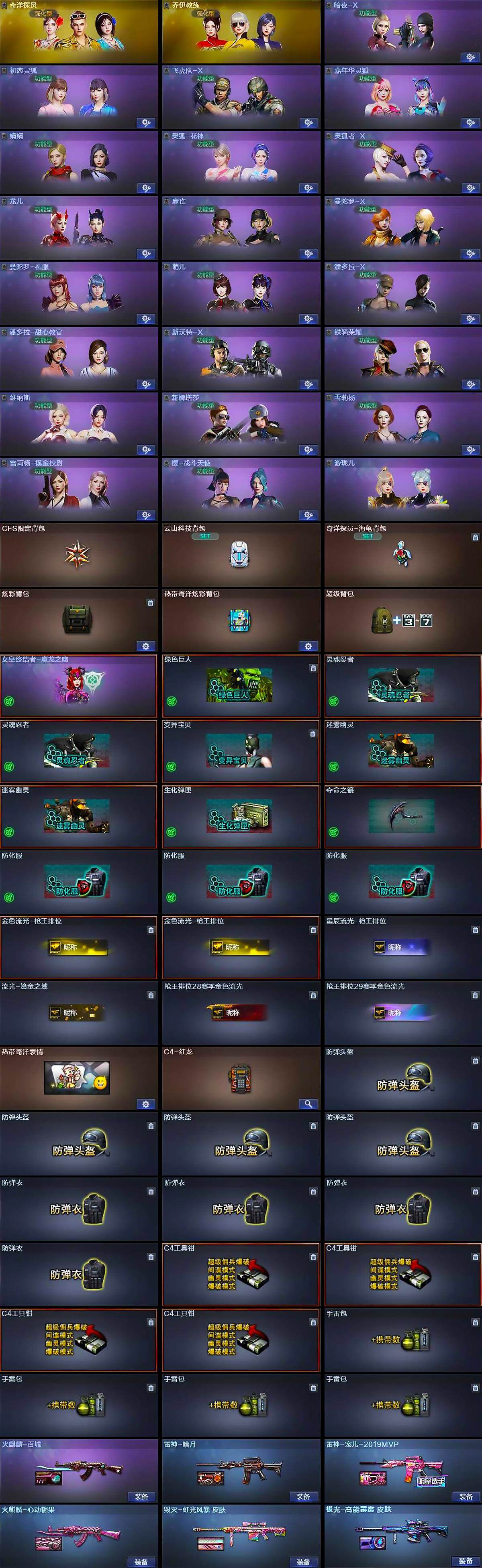 【道具】:CFS限定背包,云山科技背包,奇洋探员-海龟背包,炫彩背包,热带奇洋炫彩背包,超级背包,女皇终结者-魔龙之吻,绿色巨人,灵魂忍者*2,变异宝贝,迷雾幽灵*2,生化弹匣,夺命之镰,防化服*3,金色流光-枪王排位*2,星辰流光-枪王排位,流光-鎏金之域,枪王排位28赛季金色流光,枪王排位29赛季金色流光,热带奇洋表情,C4-红龙,防弹头盔*4,防弹衣*4,C4工具钳*4,手雷包*4