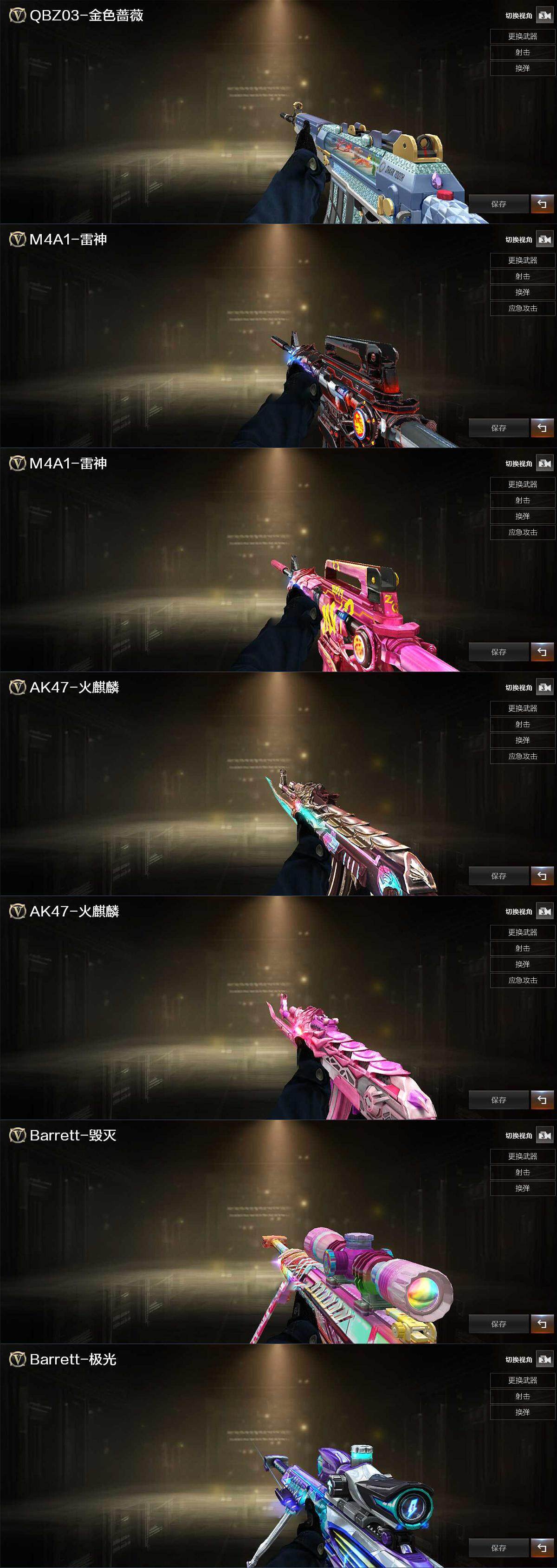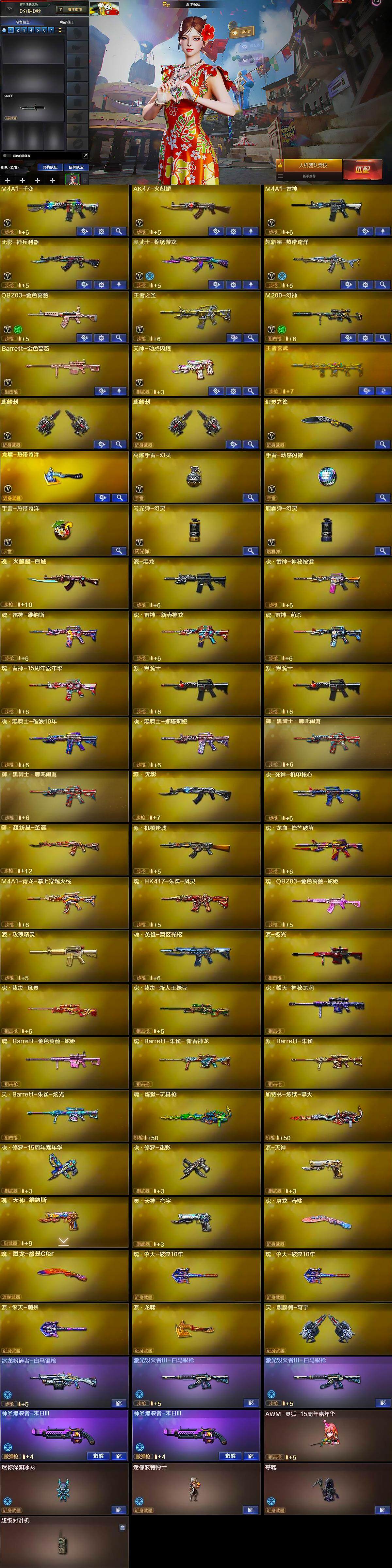 【英雄级武器】:M4A1-千变,AK47-火麒麟,M4A1-雷神,无影-神兵利器,黑武士-锦绣游龙,超新星-热带奇洋,QBZ03-金色蔷薇,王者之圣-觉醒版,M200-幻神,Barrett-金色蔷薇,天神-动感闪耀,麒麟刺*2,幻灵之锋,龙啸-热带奇洋,高爆手雷-幻灵,手雷-动感闪耀,手雷-热带奇洋,闪光弹-幻灵,烟雾弹-幻灵