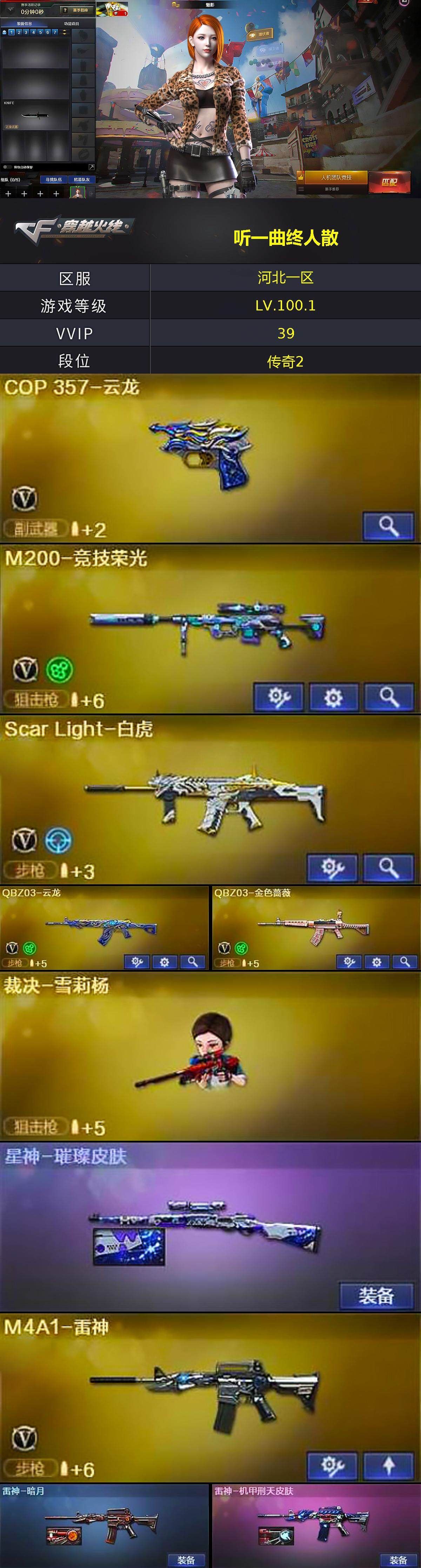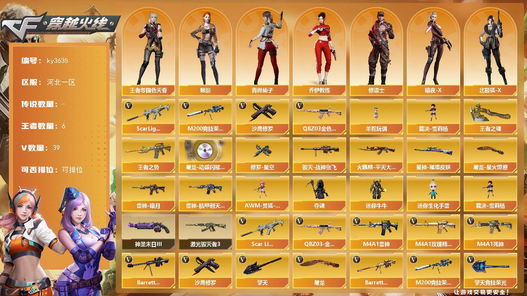 [13886339]河北一区-39V-6王者-0炫金 【热门武器】:QBZ03-金色蔷薇,Scar Light-白虎,M200-竞技荣光,羊驼玩偶,裁决-雪莉杨,沙鹰-修罗 【王者炫金武器】:王者之势,王者之啸 【音效卡】:屠龙-动感闪耀 音效卡 【皮肤】:星神-璀璨皮肤,雷神-暗月,雷神-机甲刑天皮肤,火麒麟-平天大圣,毁灭-战神张飞,修罗-星空,屠龙-星火燎原 【角色】:魅影,王者-零-国色天香,乔伊教练,修道士,暗夜-X,北极狐-X,初恋灵狐,电竞少女,风暴女,嘉年华灵狐,猎狐者-追月,灵狐者-黄金海岸,龙儿-小淘气,曼陀罗-X,萌儿,潘多拉-X,青霞仙子,夜玫瑰-宠粉,樱-战斗天使,影武者-X,游珑儿 【人偶武器】:裁决-雪莉杨,AWM-灵狐-15周年嘉年华,夺魂,迷你牛牛*3,迷你生化手雷 【挑战大师】:激光毁灭者III,神圣爆裂者-末日III 【英雄级武器】:M4A1-雷神,M4A1-死神,Scar Light-白虎,无影-神兵利器,QBZ03-云龙,黑武士-锦绣游龙,M4A1-玫瑰精灵,QBZ03-金色蔷薇,烈火-动感闪耀,黑骑士-海王,Barrett-毁灭,Barrett-朱雀,M200-竞技荣光,沙鹰-修罗,COP 357-云龙,王者之灵-觉醒版,天神-动感闪耀,屠龙,擎天,擎天-竞技荣光*2,屠龙-动感闪耀,高爆手雷-竞技荣光*3,手雷-动感闪耀,高爆手雷-云龙,闪光弹-竞技荣光*3,闪光弹-云龙*2,闪光弹-雷霆王者-觉醒版,烟雾弹-竞技荣光*3,烟雾弹-云龙,M4A1-赤狱骑士 【道具】:CFS限定背包,亚洲杯纪念炫彩背包,冰冰企鹅背包,战舰背包,女皇终结者-魔龙之吻,救世主-黑桃战神,绿色巨人,灵魂忍者,迷雾幽灵*2,夺命之镰,防化服*3,金色流光-枪王排位*2,星辰流光-枪王排位,巅峰赛先锋-金色流光,枪王排位28赛季金色流光,枪王排位29赛季金色流光,动感闪耀表情,防弹头盔*3,防弹衣*3,C4工具钳*3,手雷包*3 【特殊枪械】:1白虎