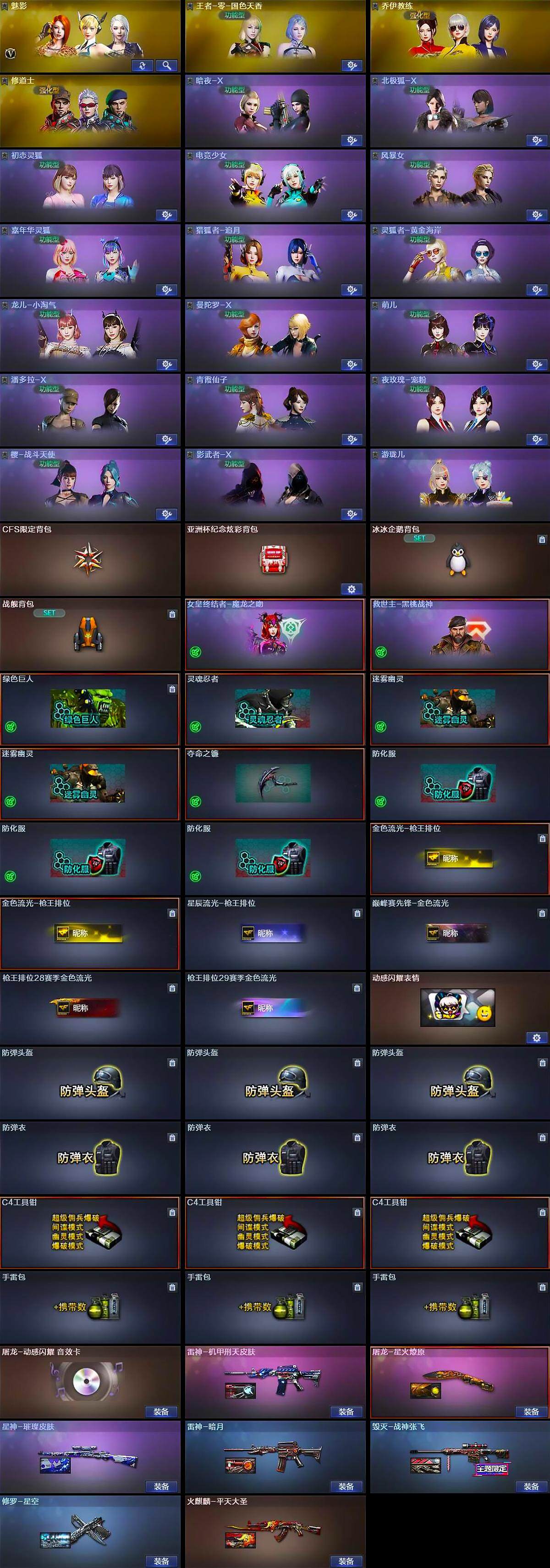 【道具】:CFS限定背包,亚洲杯纪念炫彩背包,冰冰企鹅背包,战舰背包,女皇终结者-魔龙之吻,救世主-黑桃战神,绿色巨人,灵魂忍者,迷雾幽灵*2,夺命之镰,防化服*3,金色流光-枪王排位*2,星辰流光-枪王排位,巅峰赛先锋-金色流光,枪王排位28赛季金色流光,枪王排位29赛季金色流光,动感闪耀表情,防弹头盔*3,防弹衣*3,C4工具钳*3,手雷包*3