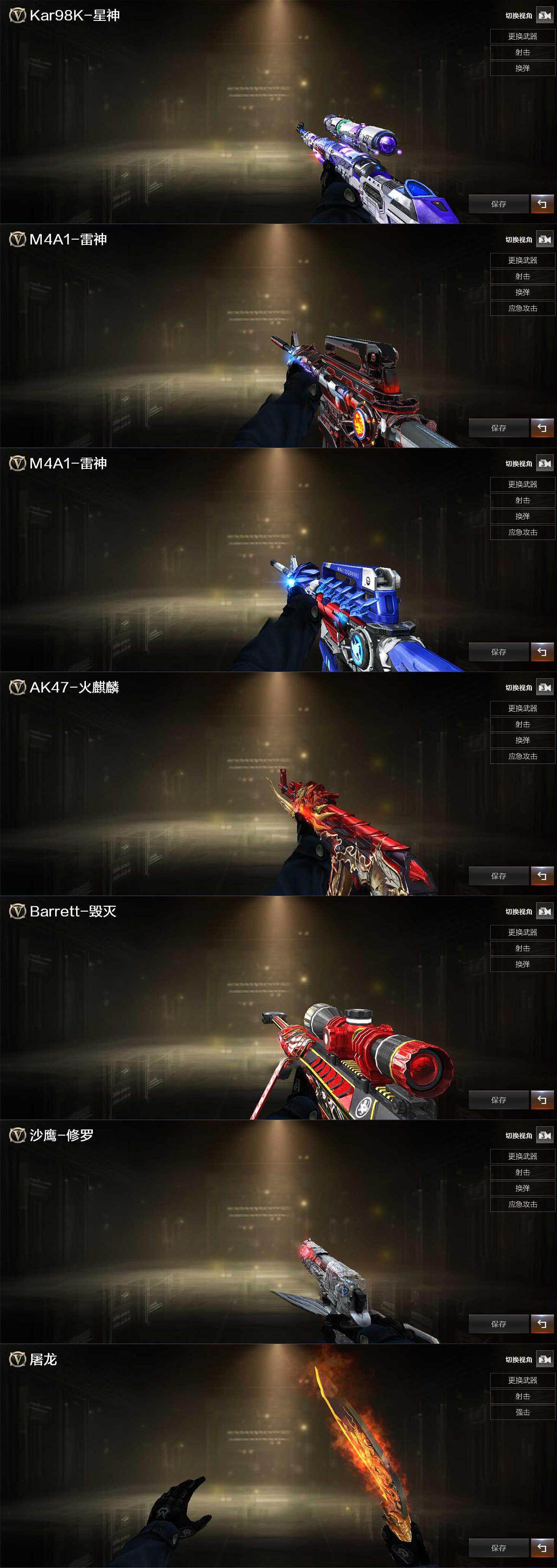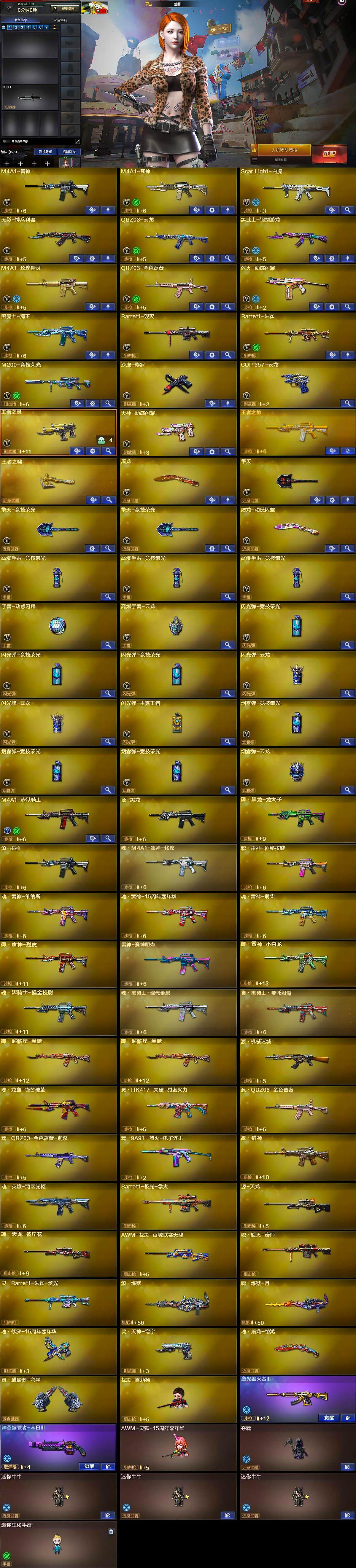 【英雄级武器】:M4A1-雷神,M4A1-死神,Scar Light-白虎,无影-神兵利器,QBZ03-云龙,黑武士-锦绣游龙,M4A1-玫瑰精灵,QBZ03-金色蔷薇,烈火-动感闪耀,黑骑士-海王,Barrett-毁灭,Barrett-朱雀,M200-竞技荣光,沙鹰-修罗,COP 357-云龙,王者之灵-觉醒版,天神-动感闪耀,屠龙,擎天,擎天-竞技荣光*2,屠龙-动感闪耀,高爆手雷-竞技荣光*3,手雷-动感闪耀,高爆手雷-云龙,闪光弹-竞技荣光*3,闪光弹-云龙*2,闪光弹-雷霆王者-觉醒版,烟雾弹-竞技荣光*3,烟雾弹-云龙,M4A1-赤狱骑士