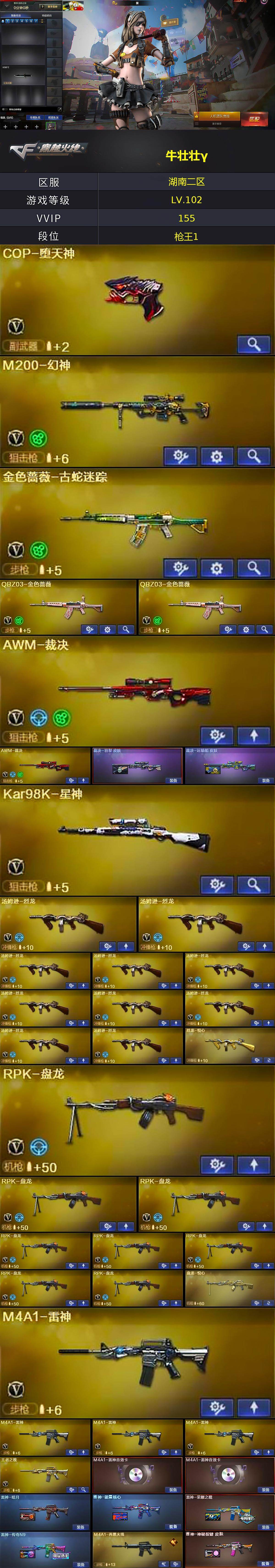 [13886170]湖南二区-151V-13王者-0炫金 【热门武器】:QBZ03-金色蔷薇*2,HK417-朱雀,M200-幻神,金色蔷薇-古蛇迷踪,修罗-古蛇迷踪,死亡之眼,Kar98K-星神,金色小号,C.A.T,M4A1-黑骑士*4,汤姆逊-烈龙*10,RPK-盘龙*8,加特林-炼狱*2,降世魔童*2,COP-堕天神,沙鹰-修罗*7 【王者炫金武器】:王者之心,王者之怒,盘龙-悦心,炼狱-悦蓝,烈龙-悦心,王者之魂 【音效卡】:AK47-火麒麟音效卡,M4A1-雷神音效卡*2,M4A1-黑骑士音效卡,Barrett-毁灭音效卡,Barrett-碧霄极光音效卡,炼狱-百战金芒-庆典舞曲音效卡,死神-雪域霜狐-怀旧音效卡 【皮肤】:裁决-羽掣 皮肤,裁决-运输船 皮肤,雷神-暗月,雷神-能量核心,雷神-荣耀之魄,雷神-传奇N9,M4A1-再燃火线,雷神-神秘按键 皮肤,火麒麟-雷神,毁灭-暗月,毁灭耀金皮肤,毁灭-星空,黑龙-能量核心,黑龙-暗月,黑骑士-暗月*3,黑骑士耀金皮肤,无影-暗月,无影耀金皮肤,死神-秘银,天启-暗月*3,战神-粉色甜心皮肤,战神-紫绶金章皮肤,战神-流金岁月皮肤,天龙-秘银,AWM-再燃火线,极光-能量核心*2,修罗-能量核心*2,天神-暗月,屠龙-荣耀之锋,屠龙-惊鸿 皮肤,轻型军用手斧-再燃火线 【角色】:葵,樱,瞳,魅影,战地猎狐,王者-葵-貂蝉,雪域霜狐,蛇隐宗,暗夜-X,灵狐者-黄金海岸,潘多拉-X,潘多拉-甜心教官,潜龙队-X,青霞仙子,蛇姬,蜀雪,铁骑荣耀,铁扇公主-暗灵,新灵狐者,新娜塔莎,雪莉杨,影武者-X,智影,雅典娜 【人偶武器】:火麒麟-灵狐,异变清道夫-蛇影双骄,COP-旗袍,C.A.T,迷你生化手雷*2,闪光弹-小乔,降世魔童*2 【暴走生化】:死亡之眼,超级对讲机 【挑战大师】:神圣爆裂者III,AK47-冰龙粉碎者,VEPR-12-金魔*2,激光毁灭者III*4 【英雄级武器】:M4A1-千变,AK47-火麒麟*4,M4A1-黑龙*3,M4A1-雷神*4,M4A1-黑骑士*4,AK47-无影*2,M4A1-死神*3,AK47-黑武士,AK12-天启*2,AN94-超新星*3,AK47-机械迷城,AK47-黑鲨,M4A1-雷霆,HK417-朱雀,金色蔷薇-古蛇迷踪,死神-雪域霜狐,M4A1-玫瑰精灵*2,QBZ03-金色