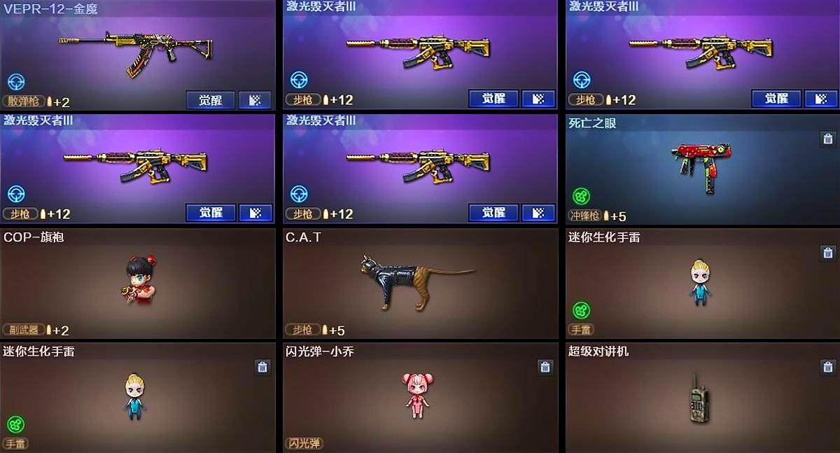 【热门武器】:QBZ03-金色蔷薇*2,HK417-朱雀,M200-幻神,金色蔷薇-古蛇迷踪,修罗-古蛇迷踪,死亡之眼,Kar98K-星神,金色小号,C.A.T,M4A1-黑骑士*4,汤姆逊-烈龙*10,RPK-盘龙*8,加特林-炼狱*2,降世魔童*2,COP-堕天神,沙鹰-修罗*7