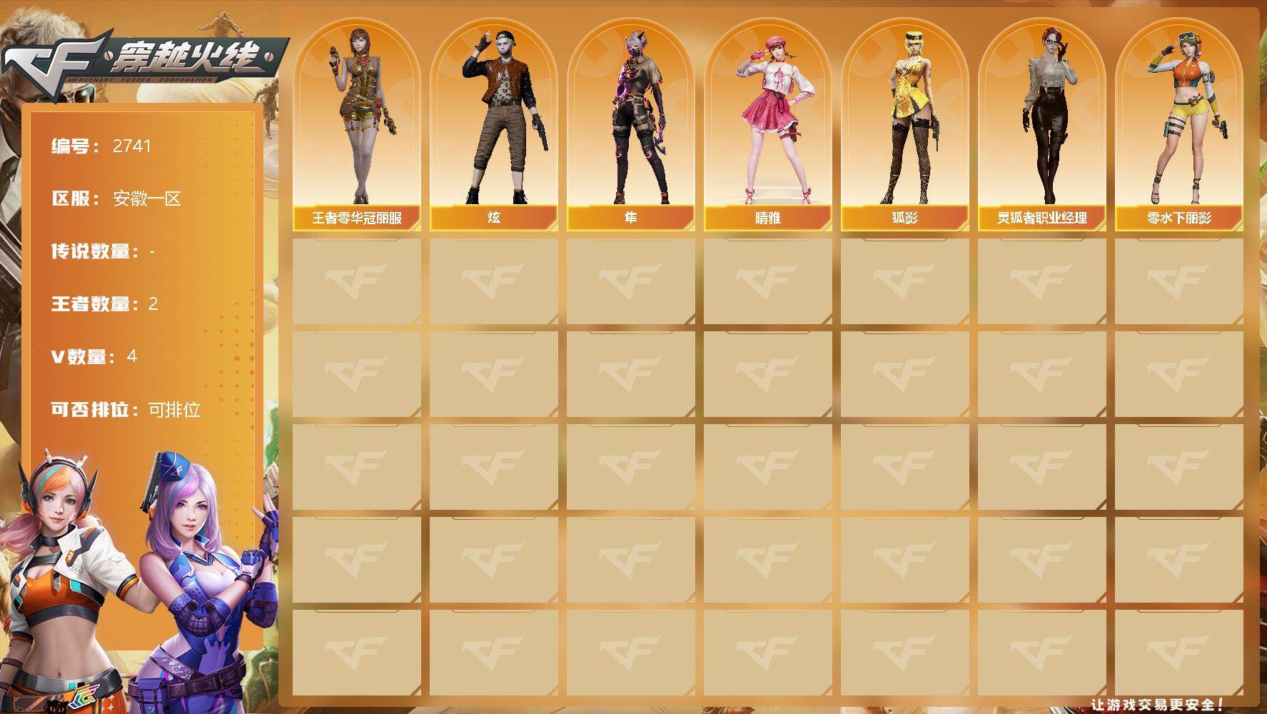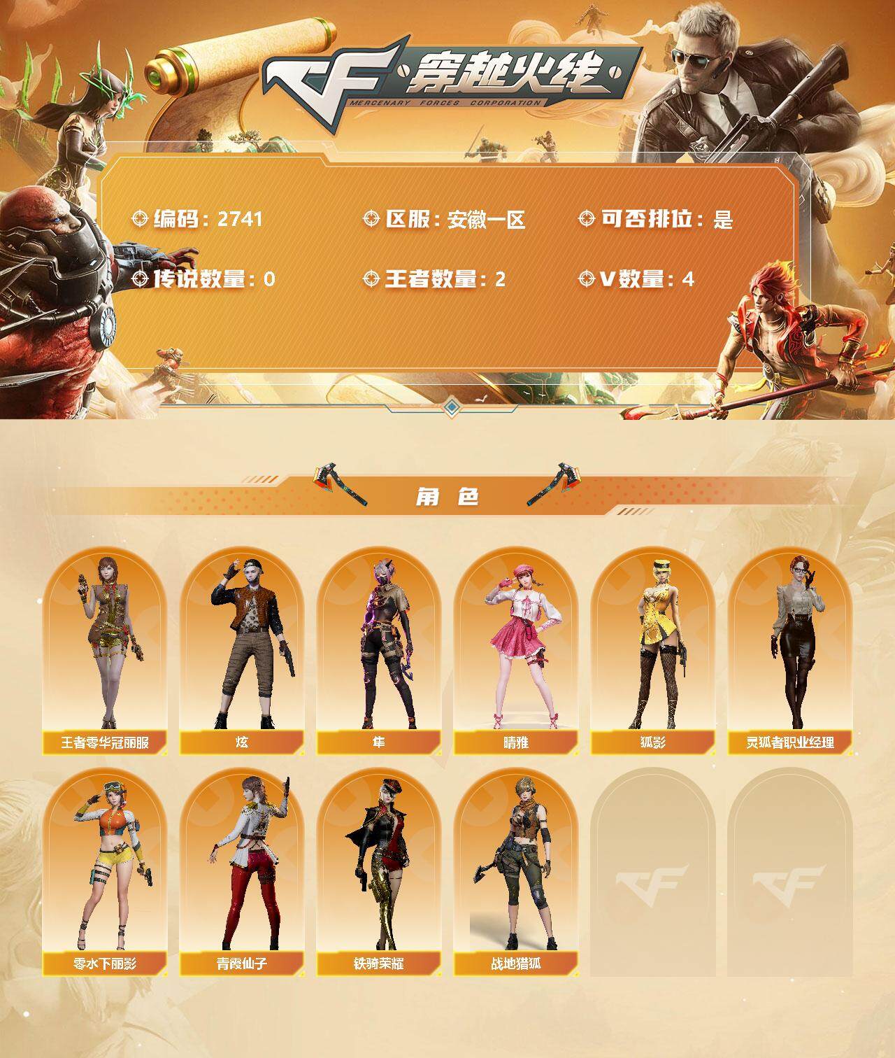 [13886775]安徽一区-4V-2王者-0炫金 【角色】:王者零-华冠丽服,狐影,零-水下丽影,灵狐者-职业经理,炫,晴雅,隼,战地猎狐,铁骑荣耀,青霞仙子 【特殊枪械】: