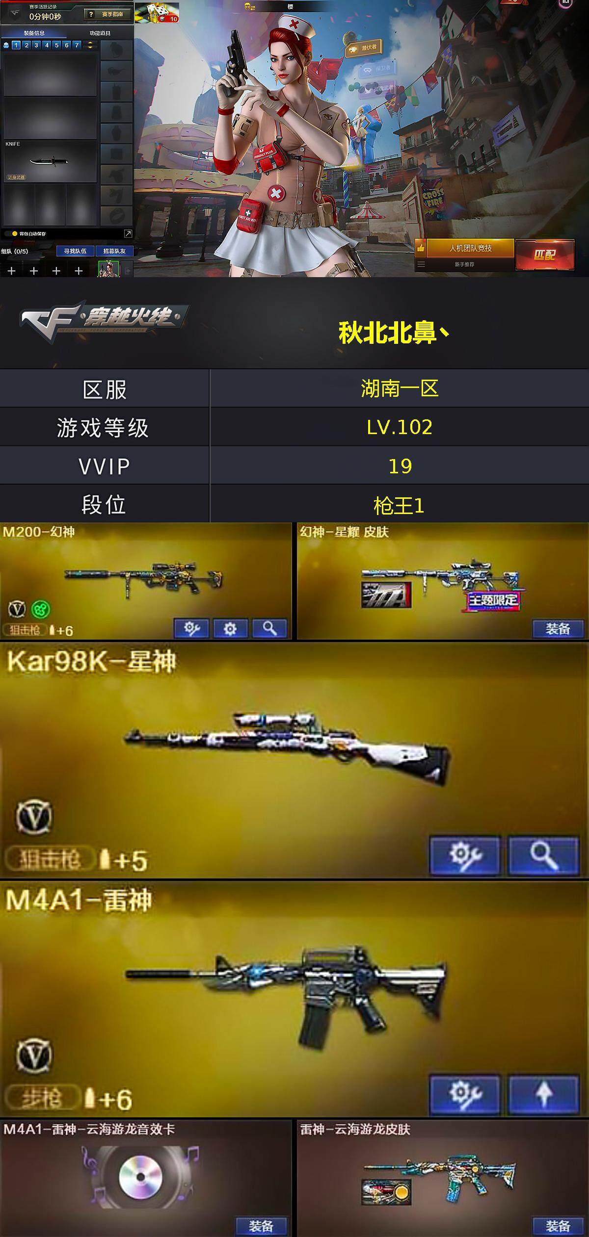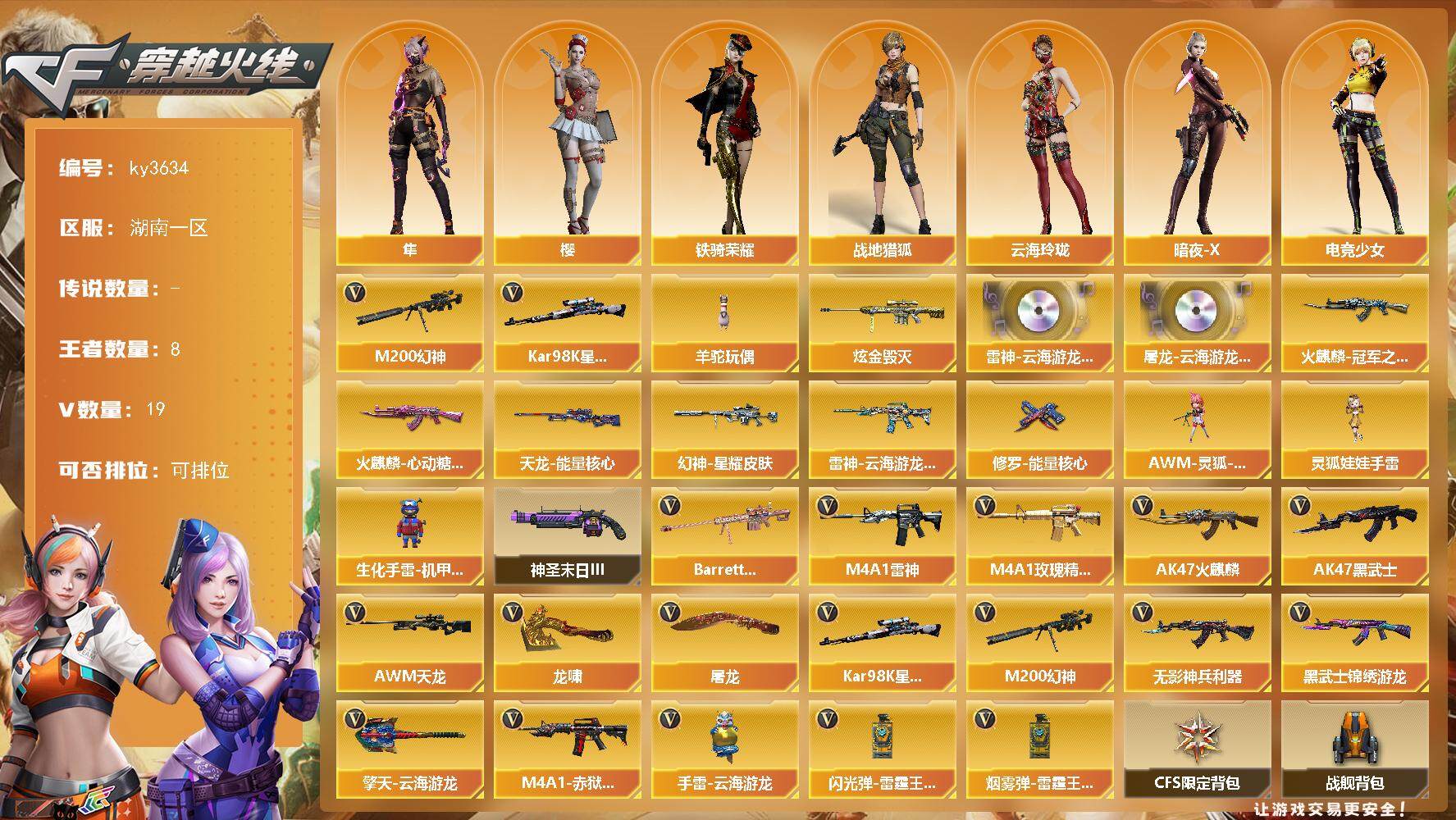 [13886634]湖南一区-19V-8王者-1炫金 【热门武器】:M200-幻神,Kar98K-星神,羊驼玩偶 【王者炫金武器】:炫金毁灭 【音效卡】:屠龙-云海游龙音效卡,M4A1-雷神-云海游龙音效卡 【皮肤】:幻神-星耀 皮肤,雷神-云海游龙皮肤,火麒麟-冠军之心,火麒麟-心动糖果,天龙-能量核心,修罗-能量核心 【角色】:樱,隼,战地猎狐,云海玲珑,暗夜-X,电竞少女,风暴女*2,嘉年华灵狐,灵狐者-X,麻雀,曼陀罗-X,潘多拉-X,蛇姬,铁骑荣耀,影武者-X,游珑儿 【人偶武器】:AWM-灵狐-15周年嘉年华,生化手雷-机甲核心,灵狐娃娃手雷 【挑战大师】:神圣爆裂者-末日III 【英雄级武器】:AK47-火麒麟*2,M4A1-雷神,AK47-黑武士,无影-神兵利器,黑武士-锦绣游龙,M4A1-玫瑰精灵,AWM-天龙,M200-幻神,Kar98K-星神,Barrett-金色蔷薇,屠龙,龙啸,擎天-云海游龙,手雷-云海游龙,闪光弹-雷霆王者-觉醒版*2,烟雾弹-雷霆王者-觉醒版*2,M4A1-赤狱骑士 【道具】:CFS限定背包,战舰背包,炫彩背包,超级背包,哔哩哔哩名片,救世主-黑桃战神,绿色巨人,灵魂忍者*2,迷雾幽灵,夺命之镰,防化服*2,金色流光-枪王排位*2,星辰流光-枪王排位,枪王排位28赛季金色流光,枪王排位29赛季金色流光,云海游龙表情,EP战队名片,EP战队喷图,防弹头盔*4,防弹衣*4,C4工具钳*4,手雷包*5 【特殊枪械】: