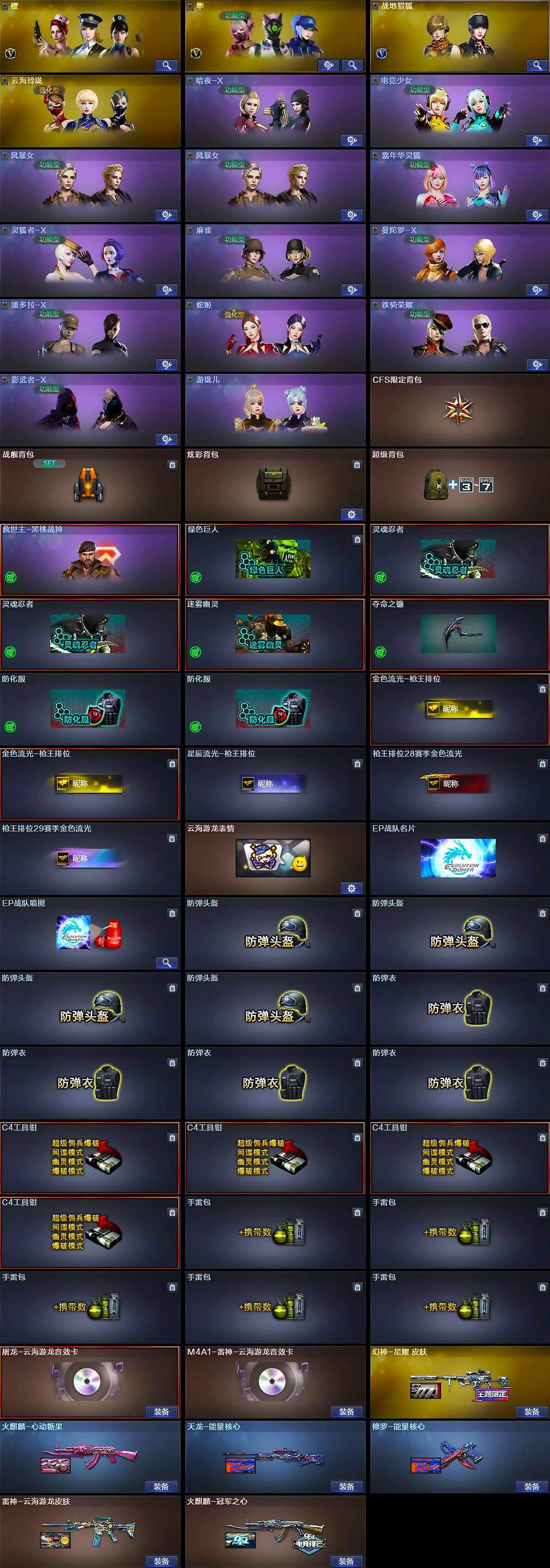 【道具】:CFS限定背包,战舰背包,炫彩背包,超级背包,哔哩哔哩名片,救世主-黑桃战神,绿色巨人,灵魂忍者*2,迷雾幽灵,夺命之镰,防化服*2,金色流光-枪王排位*2,星辰流光-枪王排位,枪王排位28赛季金色流光,枪王排位29赛季金色流光,云海游龙表情,EP战队名片,EP战队喷图,防弹头盔*4,防弹衣*4,C4工具钳*4,手雷包*5