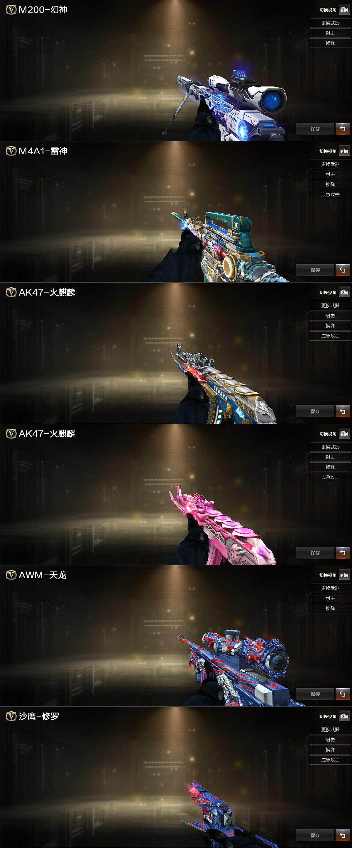 【英雄级武器】:AK47-火麒麟*2,M4A1-雷神,AK47-黑武士,无影-神兵利器,黑武士-锦绣游龙,M4A1-玫瑰精灵,AWM-天龙,M200-幻神,Kar98K-星神,Barrett-金色蔷薇,屠龙,龙啸,擎天-云海游龙,手雷-云海游龙,闪光弹-雷霆王者-觉醒版*2,烟雾弹-雷霆王者-觉醒版*2,M4A1-赤狱骑士