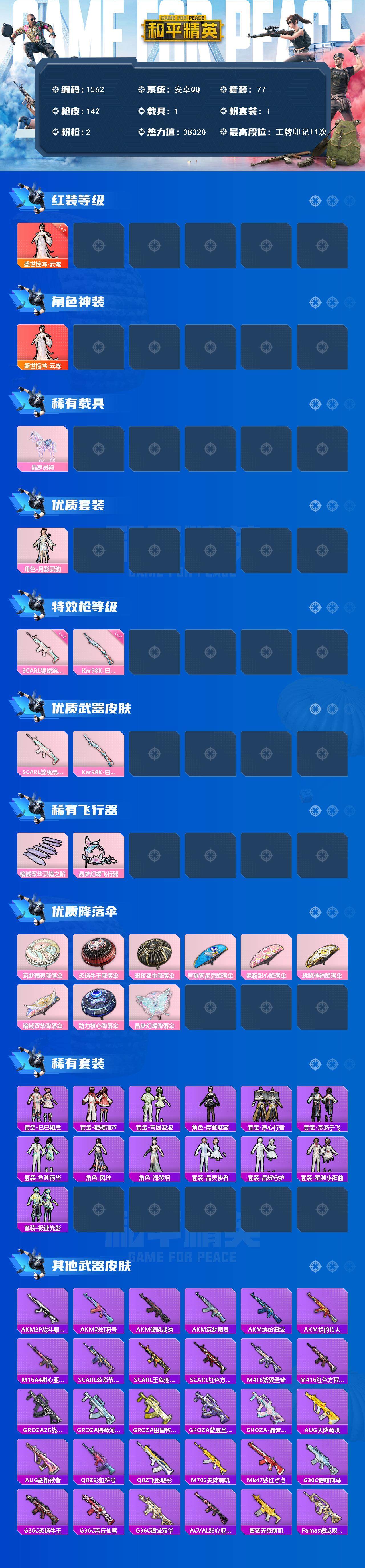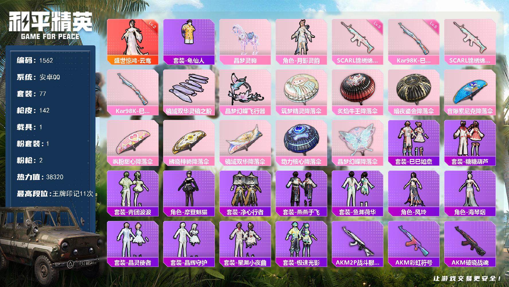 [13888021]安卓 手Q-1神装-1粉装-2特效枪-1载具-2粉色飞行器-38320热力值-11王牌印记-77套装-142枪皮 【红色神装等级】:盛世惊鸿-云鸾(二级) 【红色角色神装】:盛世惊鸿-云鸾 【热门品类】:套装-龟仙人 【粉色载具】:晶梦灵驹 【粉色套装】:角色-月影灵韵 【粉色枪皮等级】:SCAR-L-锦绣绵绵(五级),Kar98K-巳巳如意(五级) 【粉色枪皮】:SCAR-L-锦绣绵绵,Kar98K-巳巳如意 【粉色飞行器】:镜域双华-灵镜之阶,晶梦幻蝶飞行器 【粉色降落伞】:筑梦精灵降落伞,炙焰牛王降落伞,暗夜鎏金降落伞,音爆索尼克降落伞,飒粉甜心降落伞,拂晓神骑降落伞,镜域双华降落伞,动力核心降落伞,晶梦幻蝶降落伞 【稀有套装】:套装-龟仙人,套装-巳巳如意,套装-糖糖葫芦,套装-青团波波,角色-摩登魅猫,套装-净心行者,套装-燕燕于飞,套装-鱼渊荷华,角色-风玲,角色-海琴烟,套装-晶灵使者,套装-晶辉守护,套装-星渊小夜曲,套装-极速光影 【稀有枪皮】:AKM-2P战斗服款,AKM-彩虹符号,AKM-破晓战魂,AKM-筑梦精灵,AKM-缤纷海域,AKM-龙的传人,M16A4-甜心亚梦,SCAR-L-炫彩节奏,SCAR-L-玉兔迎春,SCAR-L-红色方程式,M416-紫翼圣骑,M416-红色方程式,GROZA-2B战斗服款,GROZA-懵萌河马,GROZA-田园牧歌,GROZA-紫翼圣骑,GROZA-晶梦幻蝶,AUG-天降萌叽,AUG-耀粉歌者,QBZ-彩虹符号,QBZ-飞驰魅影,M762-天降萌叽,Mk47-妙红点点,G36C-镜域双华,G36C-懵萌河马,G36C-炙焰牛王,G36C-青丘仙客,AC-VAL-甜心亚梦,蜜獾-天降萌叽,Famas-镜域双华,UZI-天降萌叽,UZI-红色方程式,UMP45-涂山之恋,UMP45-炫光之旅,UMP45-蓝色火焰,Vector-彩虹符号,Vector-田园牧歌,Vector-音爆索尼克,汤姆逊-耀粉歌者,野牛-沙丘之主,MP5K-飒粉甜心,P90-筑梦精灵,P90-飞驰魅影,P90-巳巳如意,Kar98K-飞驰魅影,Kar98K-星穹咏叹调,M24-炫彩节奏,AWM-炙焰牛王,VSS-田园牧歌,Mini14-炫彩节奏,Mini14-筑梦精灵,Win94-晶梦幻蝶,SLR-彩虹符号,SLR-月影鸳鸯,莫辛纳甘